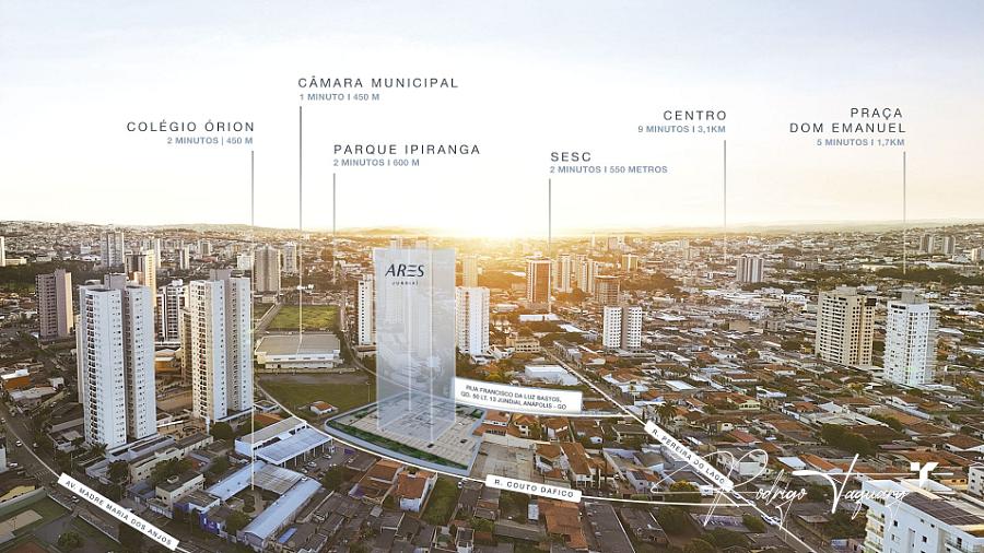 O Ares Jundiaí será o edifício mais alto da região, com rooftop no 30º pavimento e vista panorâmica 360°. Localizado no Jundiaí, bairro nobre de Anápolis, o projeto oferece plantas de 62 a 82 m², com opções de 2 ou 3 quartos, 1 suíte, lavabo, escaninho privativo e espaço office.