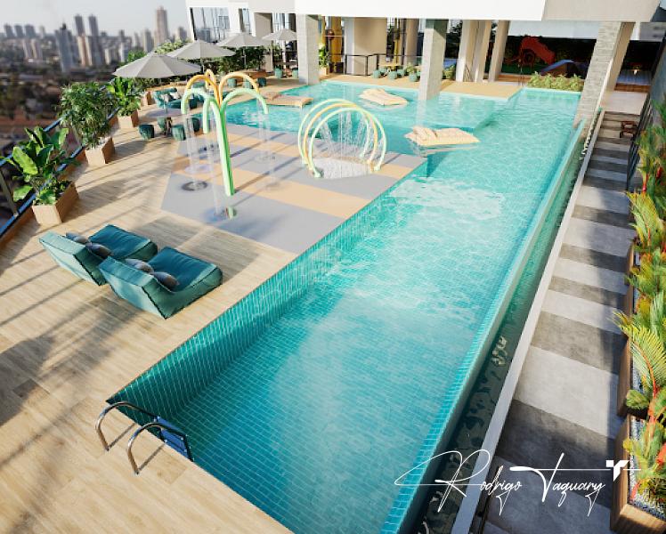 O condomínio oferece mais de 2.000 m² de lazer, incluindo piscina aquecida com borda infinita, raia de 25 m, Acqua Kids, campinho, playground frutífero, brinquedoteca e áreas B.relax, B.fit, B.tasty, B.grill e B.party — ambientes sociais completos e conectados ao paisagismo.