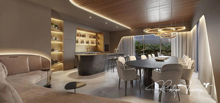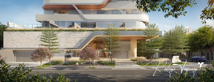 538 m² | 4 suítes plenas | Piscina privativa | Varanda dupla com pé-direito ampliado | 6 vagas privativas | VRF instalado | Possibilidade de personalização | Fechadura eletrônica | Reconhecimento facial | Preparação para carros elétricos | Fachada icônica assinada pela Pininfarina | Torre única | Vista definitiva para a Praça T-23