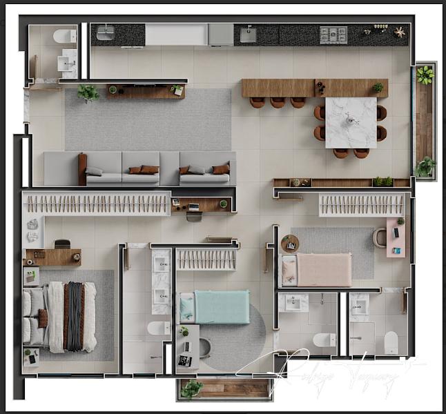 Unidade com 107,84 m², três suítes bem distribuídas, varanda gourmet funcional e ambientes integrados que ampliam a sensação de espaço. Acabamentos diferenciados e padrão construtivo elevado.