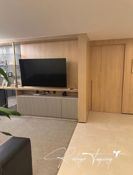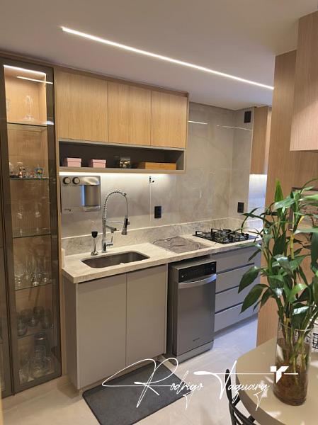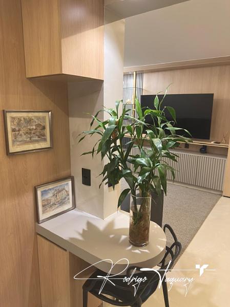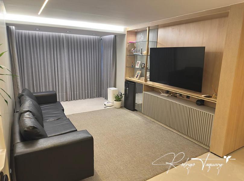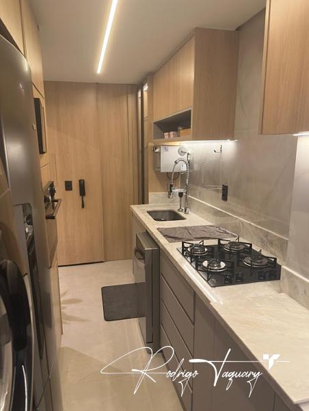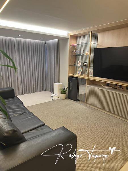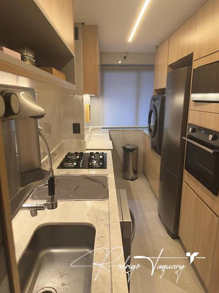 O imóvel está completo em armários planejados, cozinha equipada com lava-louças, geladeira, forno, filtro e fogão cooktop, além de máquina de lavar roupas e televisão de 80 polegadas na sala.
