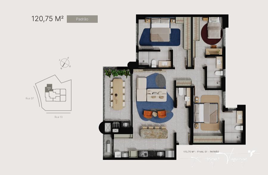 Planta com 3 suítes bem distribuídas, alto padrão de acabamento, varanda espaçosa e estrutura completa de lazer em torre única.