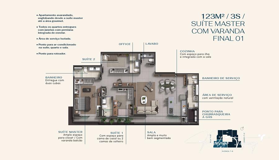 Planta funcional | Sala ampliada | 3 suítes | Varanda integrada | 2 vagas | Ponto para ar-condicionado | Fechadura eletrônica | Acabamento moderno