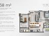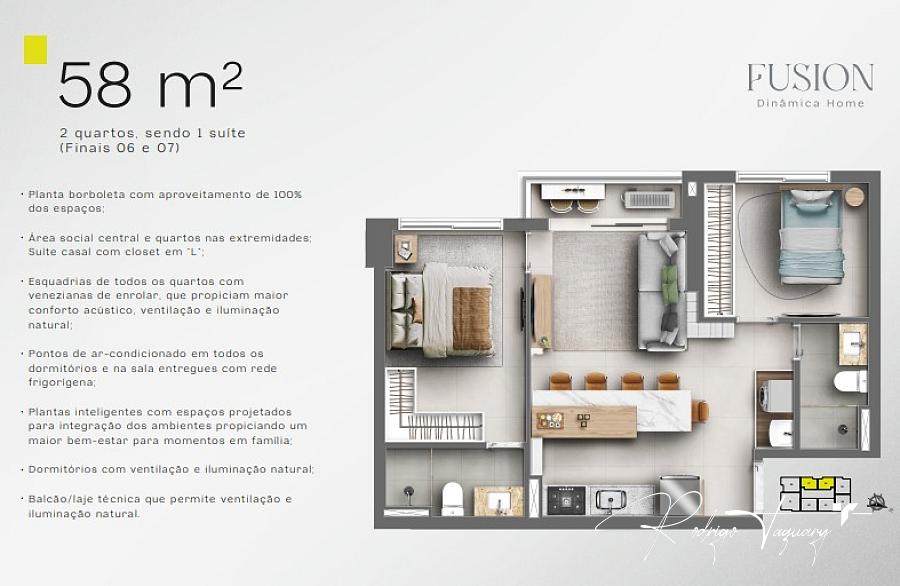 58 m² | 2 quartos (1 suíte) | Varanda balcão | Cozinha aberta | Laje técnica | 2 banheiros | Planta funcional | 1 vaga privativa