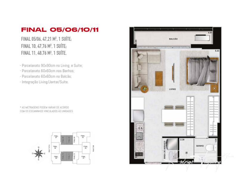 47,21 m² privativos | 1 quarto | Varanda integrada | 1 vaga de garagem | Planta inteligente e bem distribuída | Acabamento de qualidade
