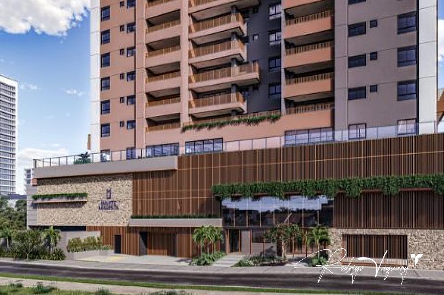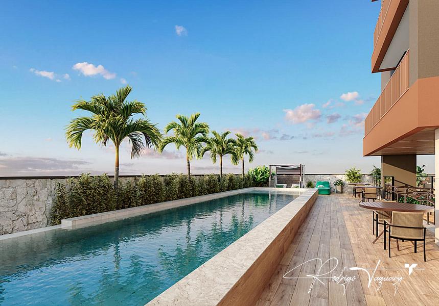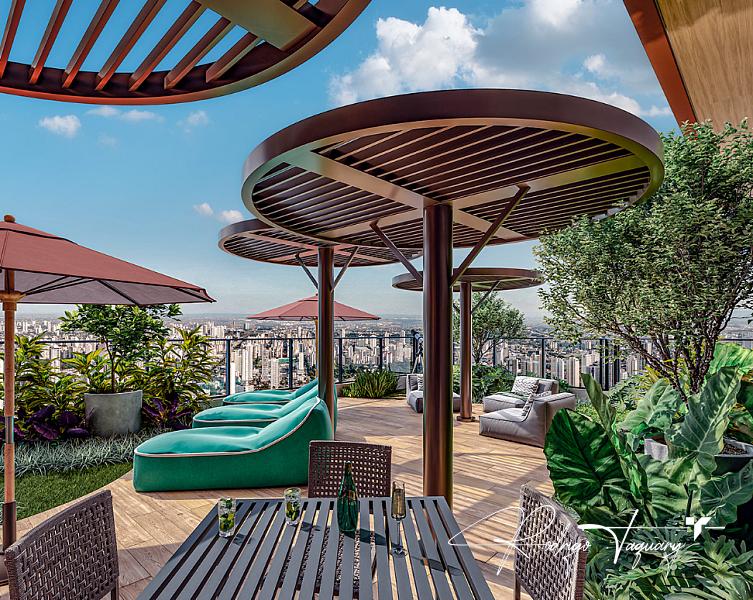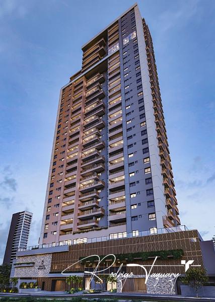 Plantas de 69 a 109 m², com opções de 2 e 3 quartos, acabamento premium, porcelanato 90x90, bancadas White Storm, varandas com granito preto escovado e lavabo em mármore branco. Rooftop no 27º andar com Praça Camarote e lazer distribuído em 3 pavimentos.