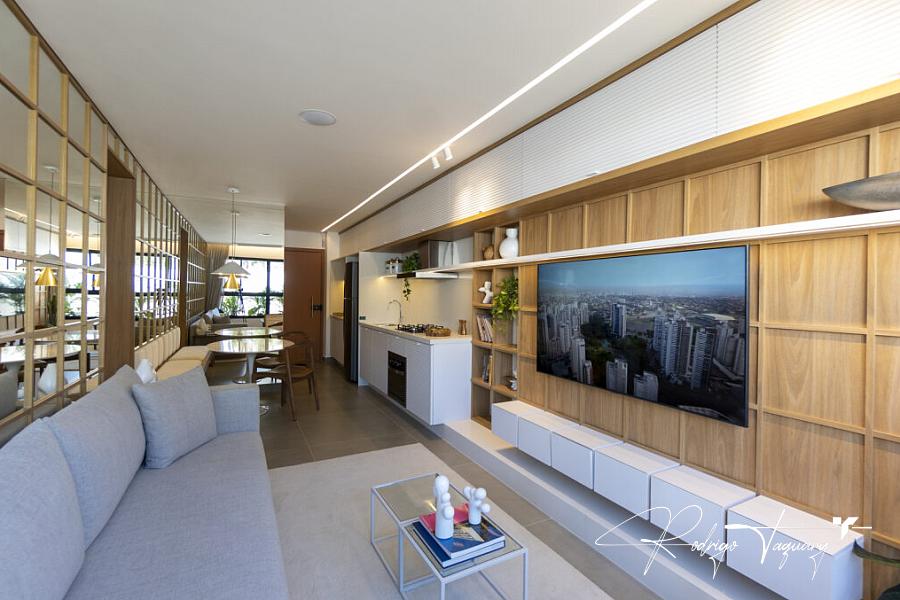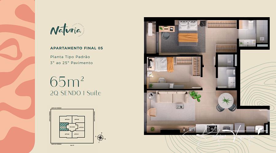 65 m² privativos | 2 quartos (1 suíte) | 1 vaga de garagem | Ambientes integrados | Planta funcional | Acabamento premium