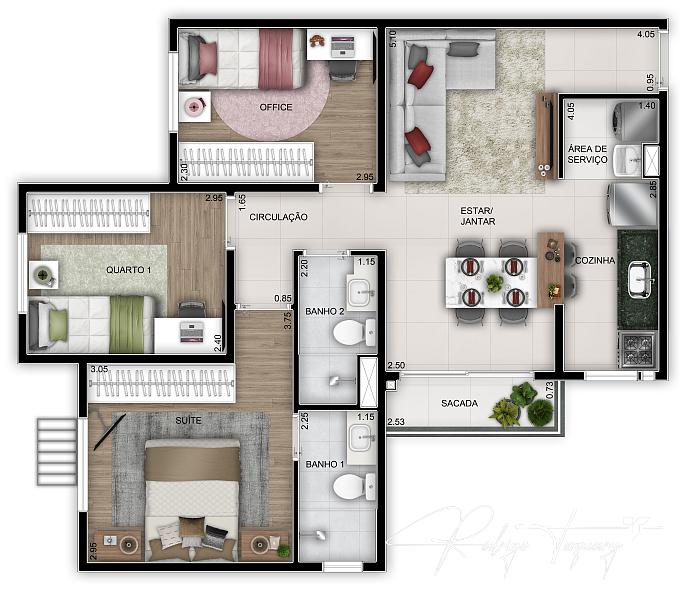 61 m² privativos | 3 quartos (1 suíte) | 2 banheiros | 2 vagas de garagem | Planta funcional e moderna