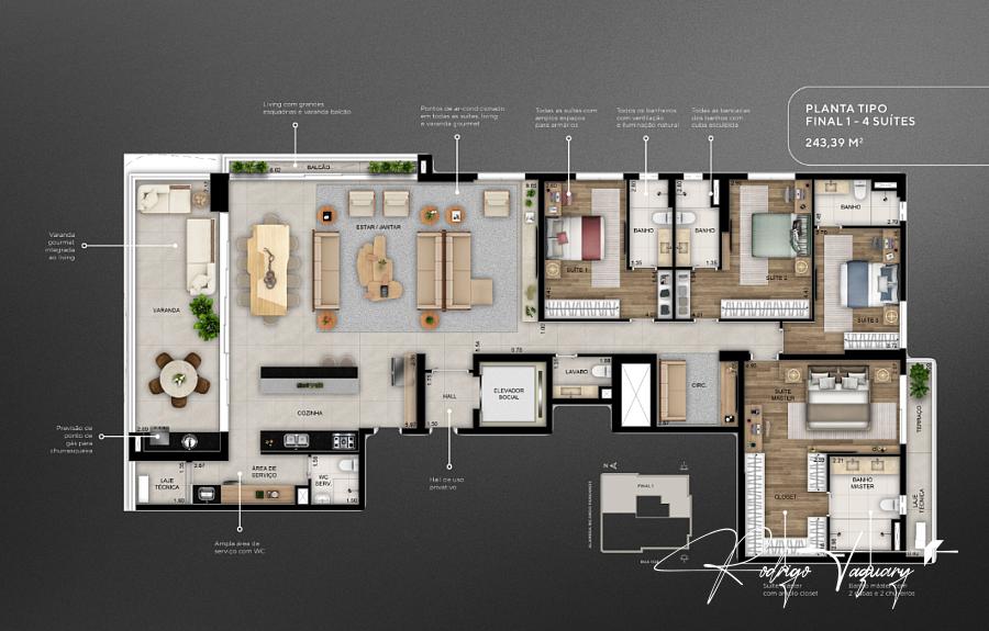 Com 243 m² de área privativa, 4 suítes plenas e 3 vagas de garagem, o projeto une design contemporâneo, funcionalidade e sofisticação, proporcionando conforto absoluto e uma experiência única de morar bem.