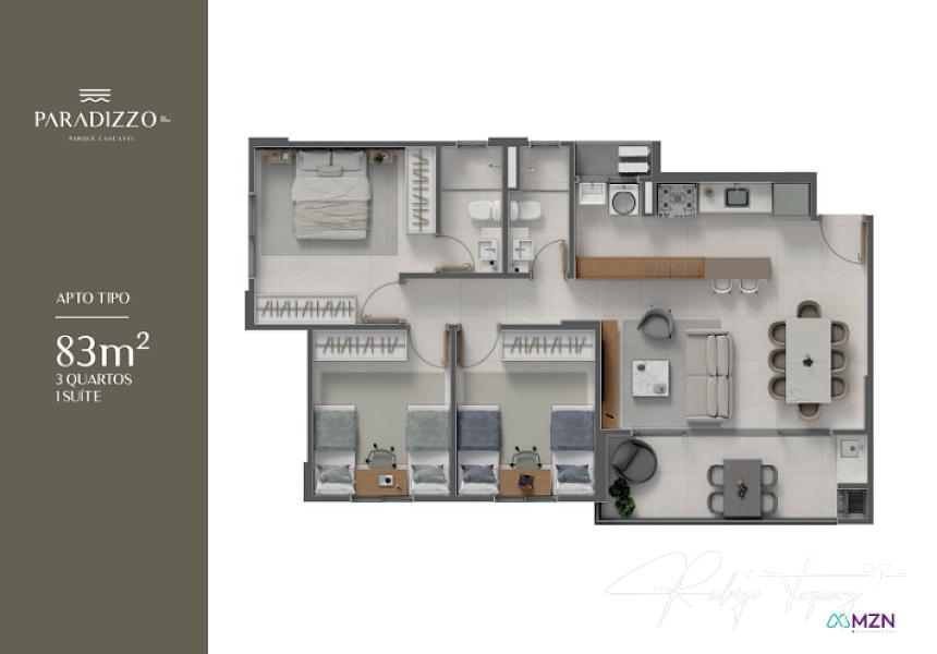Apartamento à venda no Paradizzo by MZN com 83 m², 3 quartos (sendo 1 suíte), sala integrada, cozinha funcional, banheiros ventilados naturalmente e 2 vagas de garagem. Destaque para a varanda gourmet com churrasqueira a carvão, perfeita para momentos de lazer em família. Projeto moderno, bem distribuído e com padrão construtivo de qualidade.
