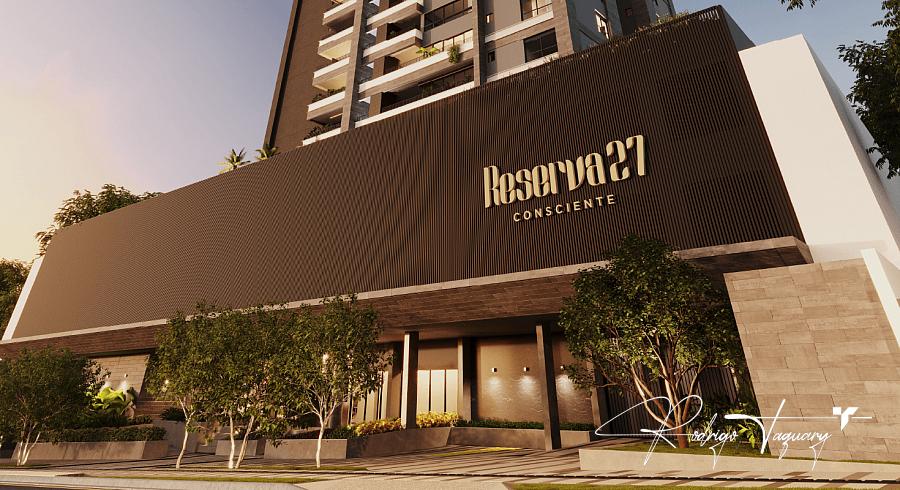 Projeto da Consciente Construtora, o Reserva 27 ocupa terreno de 3.000 m² e traz uma proposta de bem-estar, natureza e exclusividade com torre única. Paisagismo assinado pela Cardim Arquitetura, gerador para 100% do empreendimento, espaços de trabalho distribuídos em pavimentos, pet place com lounge e academia suspensa com vista panorâmica de 180º reforçam o conceito premium. Apartamentos com excelente iluminação, porcelanato nas suítes e áreas sociais, além de pé-direito de 3,06 m de laje a laje.