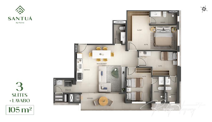 Apartamento no Santuá by Palme com 105 m², 3 suítes plenas, varanda gourmet com churrasqueira, banheiros com ventilação natural e fechadura eletrônica. Conta com 2 vagas de garagem e planta inteligente que integra conforto e funcionalidade.