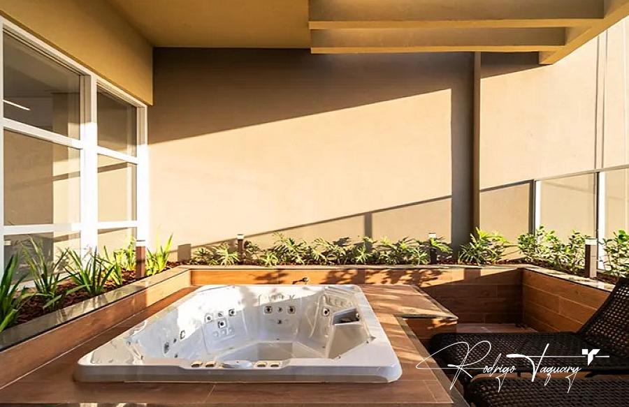A unidade conta com suíte master com closet e banheiro com cuba e ducha dupla, sala ampla com integração à varanda panorâmica, cozinha americana e acabamentos de excelência.