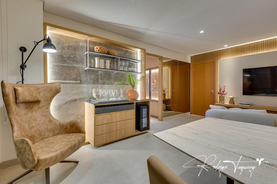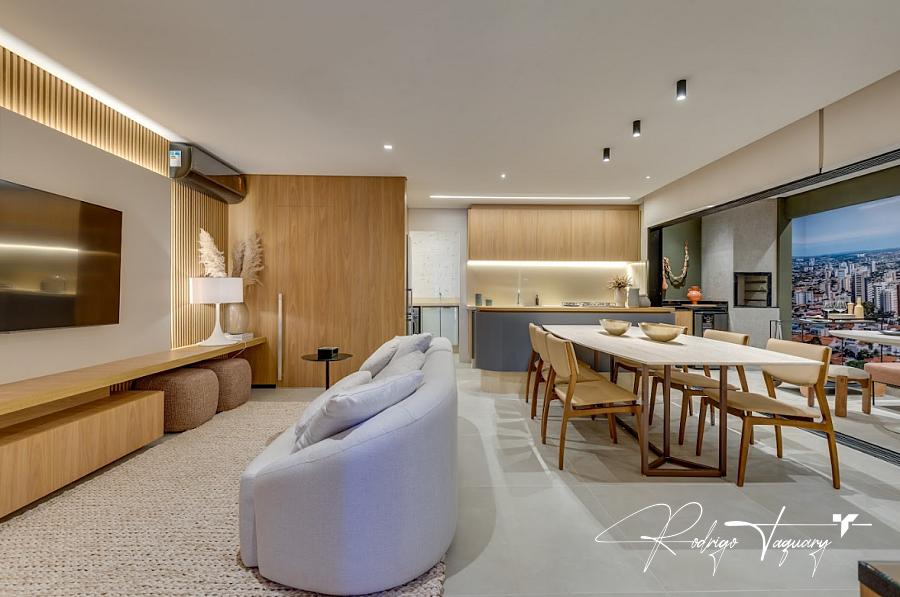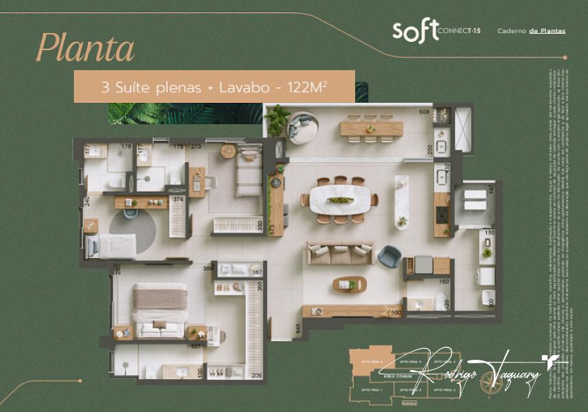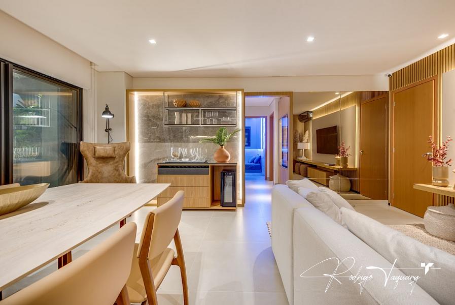 122,19 m² | 3 suítes | Sala integrada | Varanda ampla | Cozinha com bancada em granito | Banheiros com mármore | Ventilação cruzada | Planta funcional | 2 vagas privativas