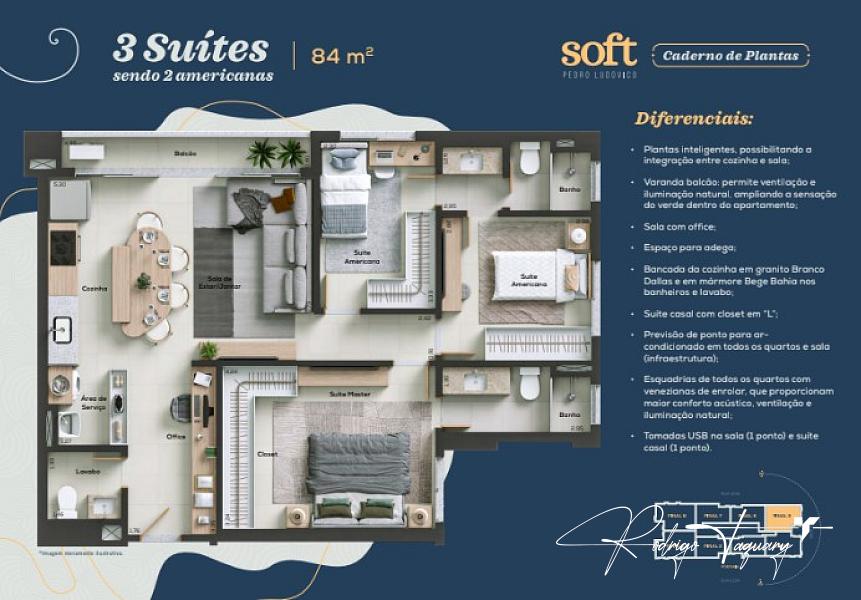 84 m² | 3 suítes (2 americanas) | 2 vagas privativas | Planta funcional | Acabamento contemporâneo | Pronto para morar