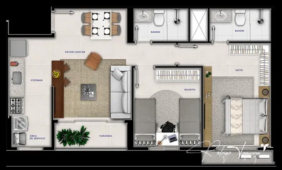 63,46 m² | 2 quartos (1 suíte) | 1 vaga | Rico em armários | Projeto luminotécnico | Cozinha e área de serviço planejadas | Nichos nos banheiros | Laje técnica | Preparação para ar-condicionado | Varanda com vista aberta