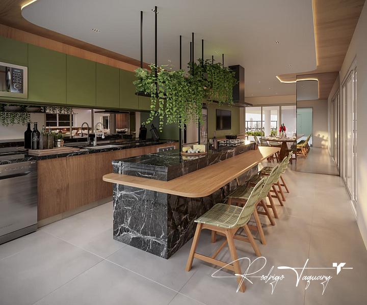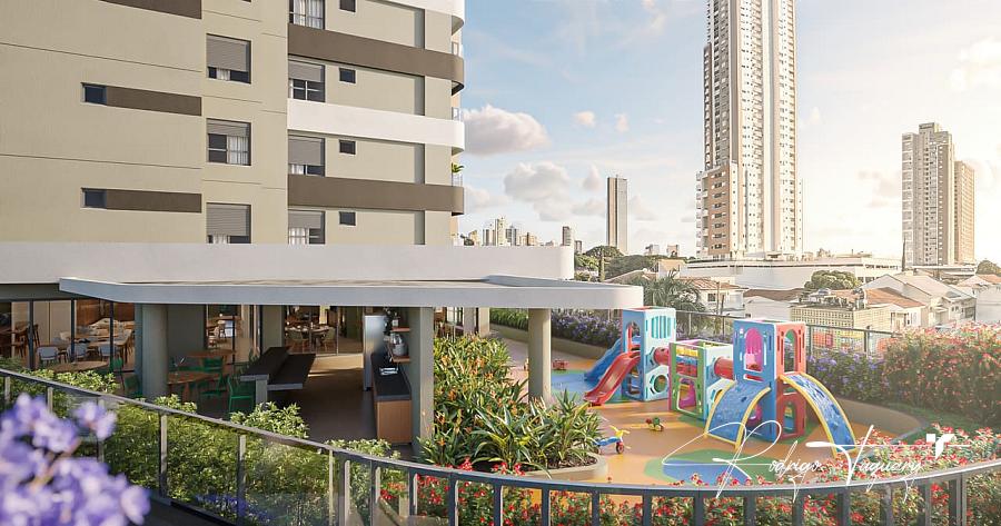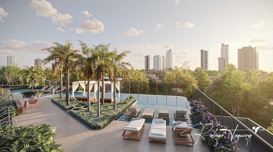 O empreendimento também se destaca pela “floresta privativa”, uma área verde integrada ao lazer, trazendo sensação de refúgio natural em meio ao bairro mais valorizado da cidade.