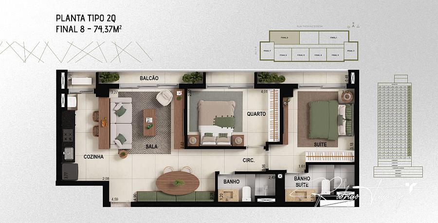 74 m² | 2 quartos | 1 suíte | Sala integrada | Planta funcional | Cozinha aberta | Acabamento de alto padrão | Ventilação mecânica | 1 vaga