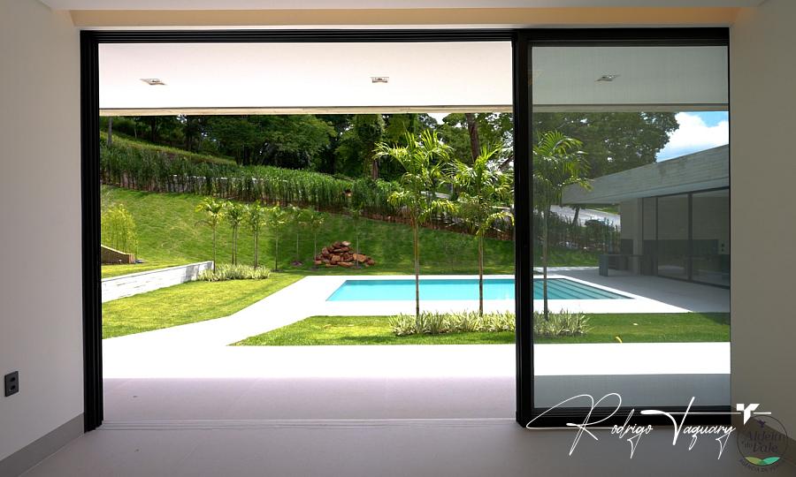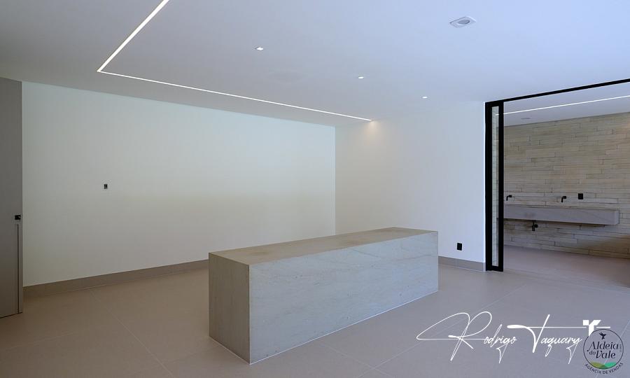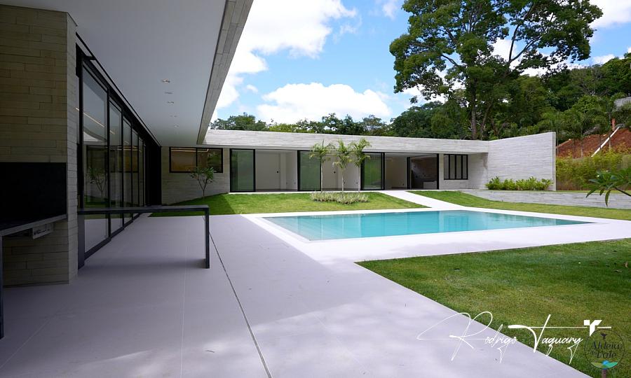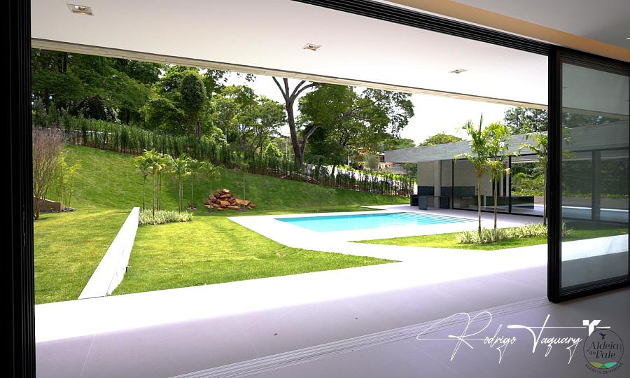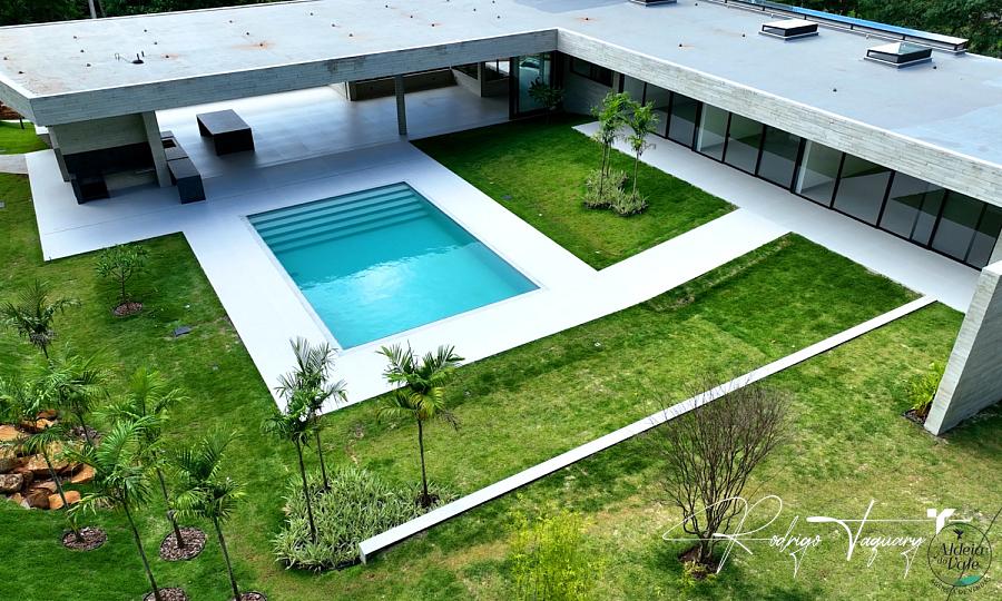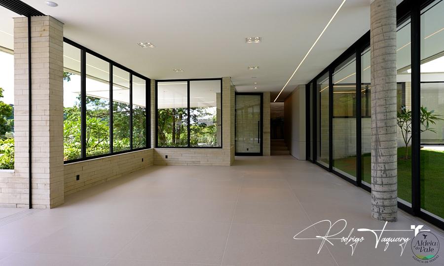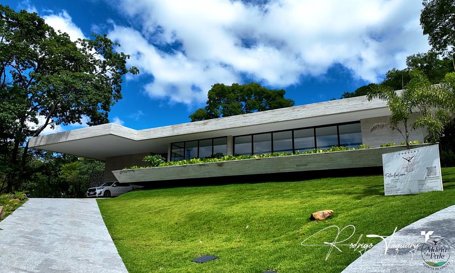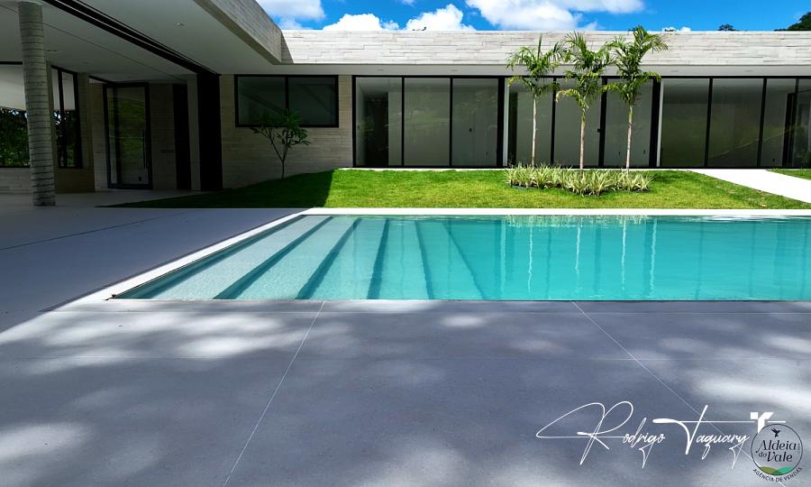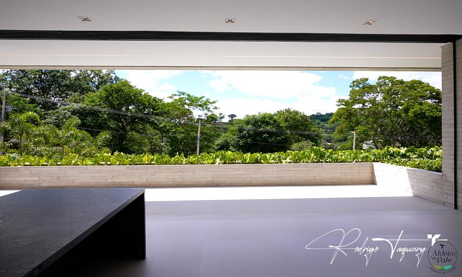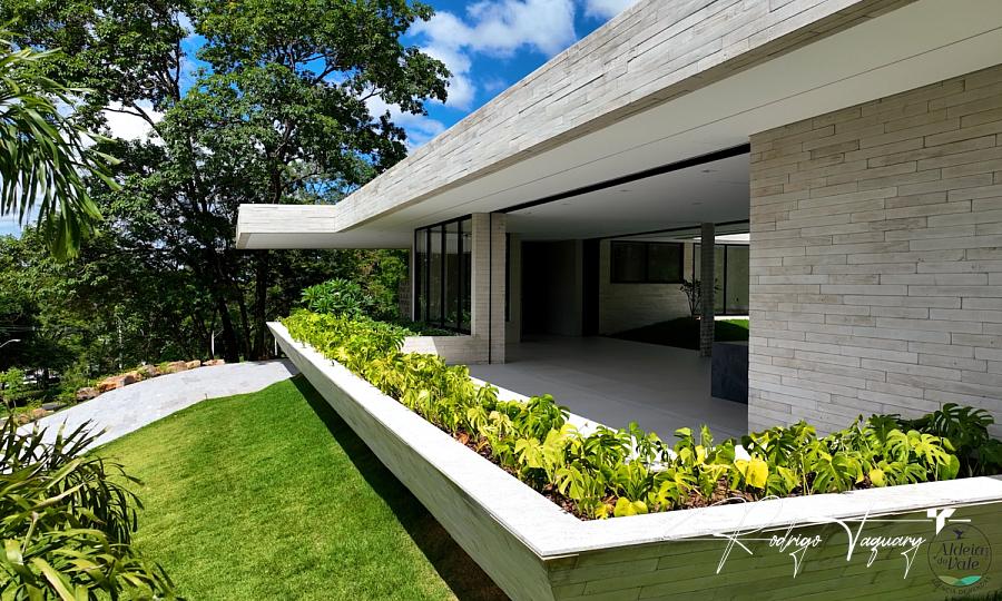 Residência exclusiva no Aldeia do Vale, com 568,03 m² de área construída em lote de 2.074,80 m². Projeto autoral de Peter Bal, que une design contemporâneo, integração total e contato permanente com a natureza. Living imponente com porta de correr motorizada de 17 m, painéis retráteis, claraboias ventiladas e paredes em ripado de concreto aparente.