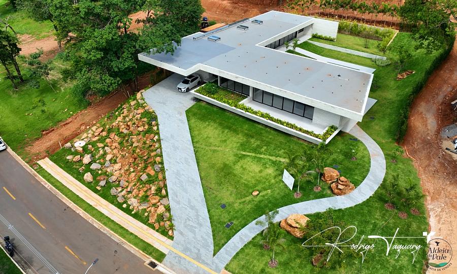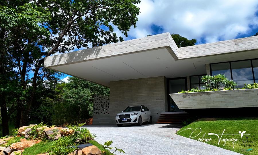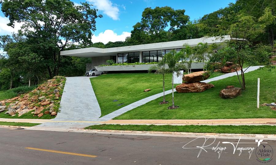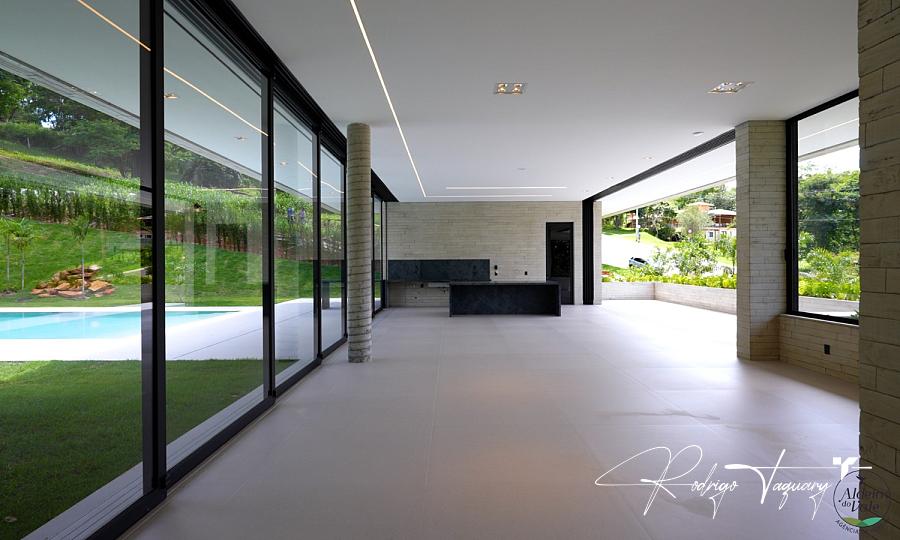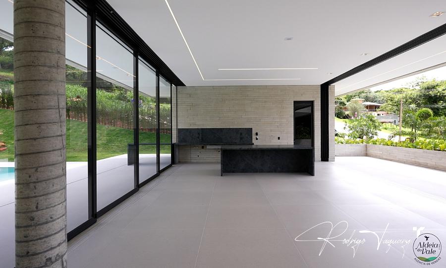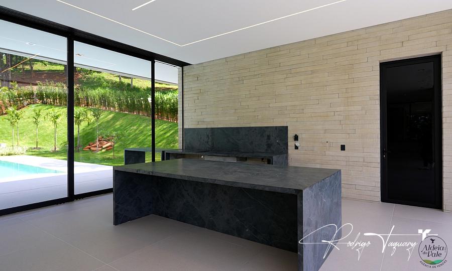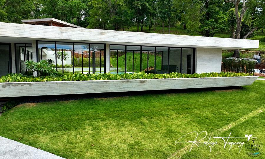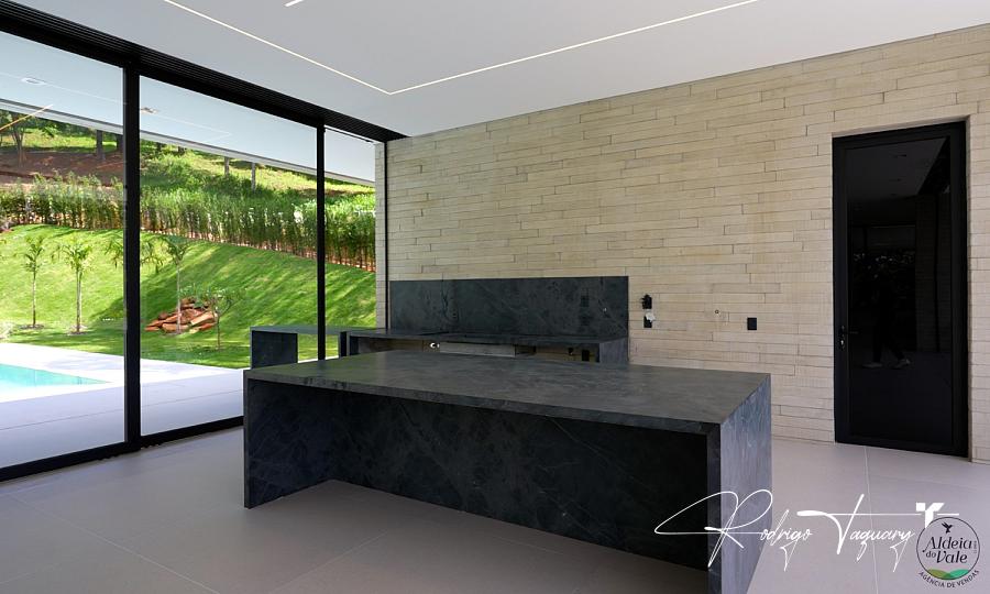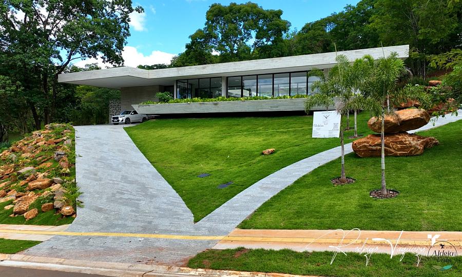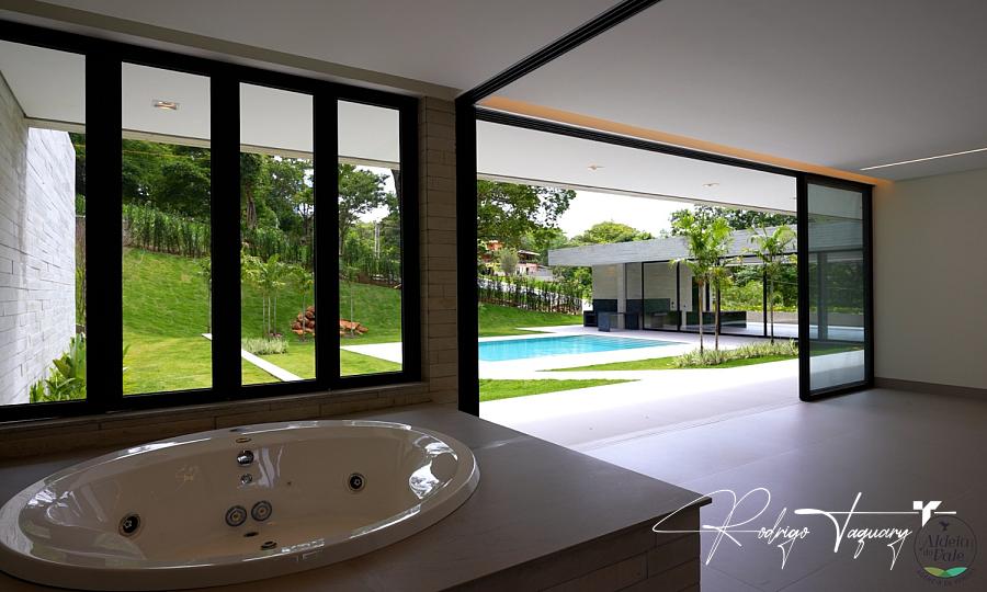 Residência exclusiva no Aldeia do Vale, com 568,03 m² de área construída em lote de 2.074,80 m². Projeto autoral de Peter Bal, que une design contemporâneo, integração total e contato permanente com a natureza. Living imponente com porta de correr motorizada de 17 m, painéis retráteis, claraboias ventiladas e paredes em ripado de concreto aparente.