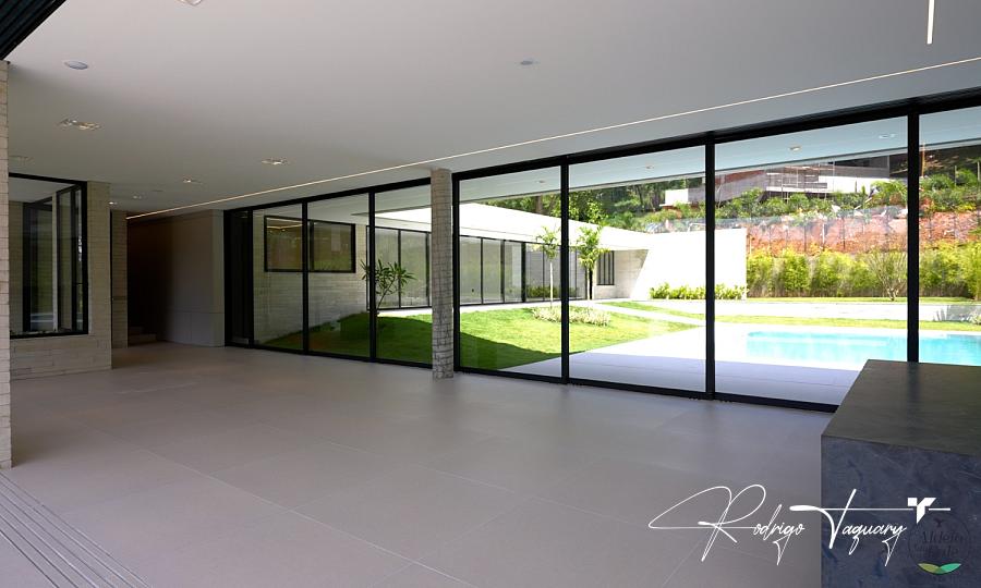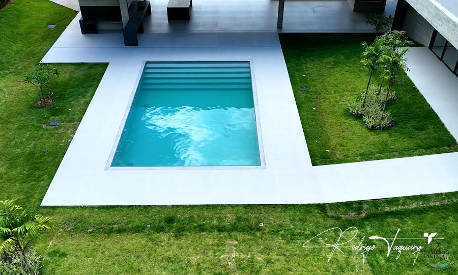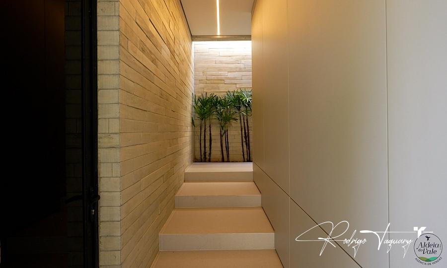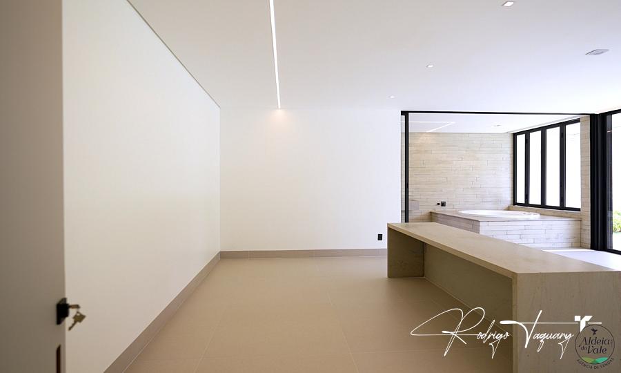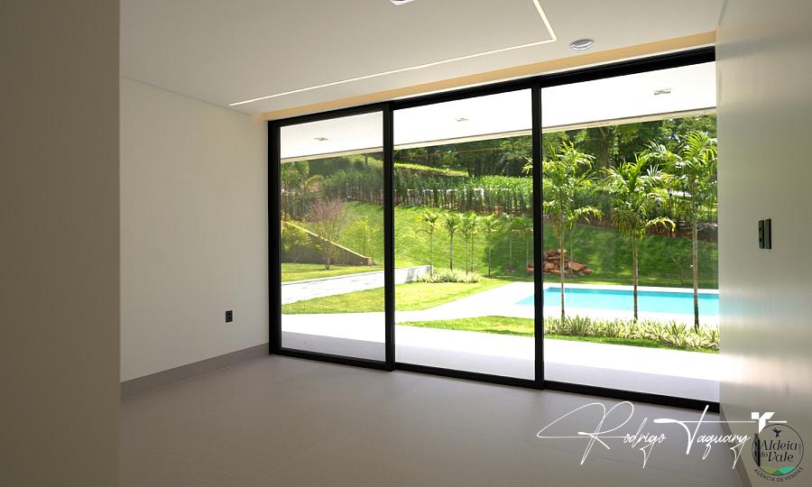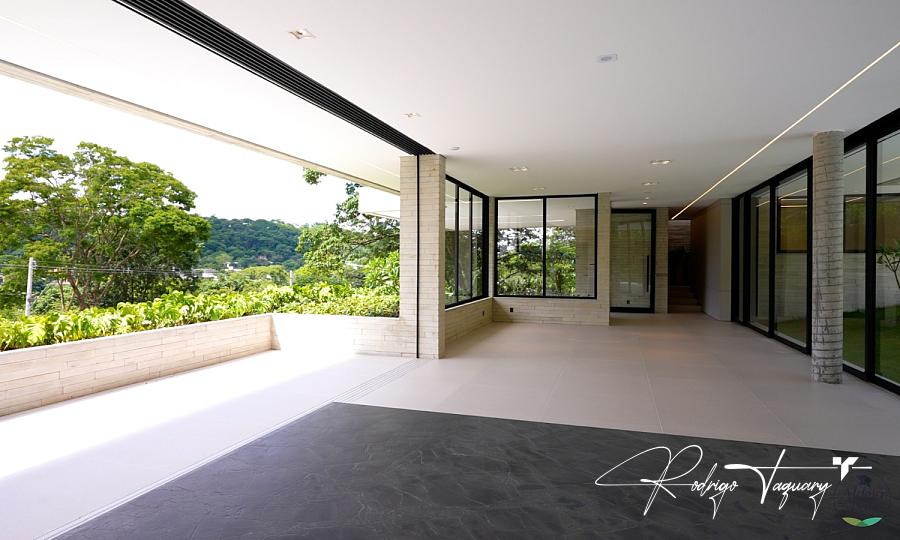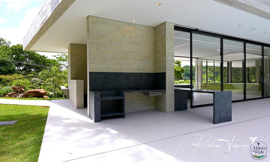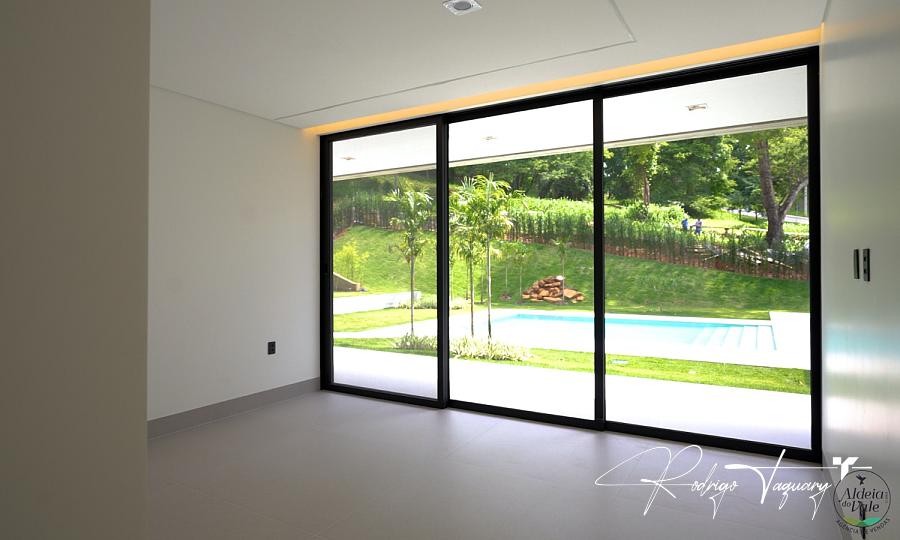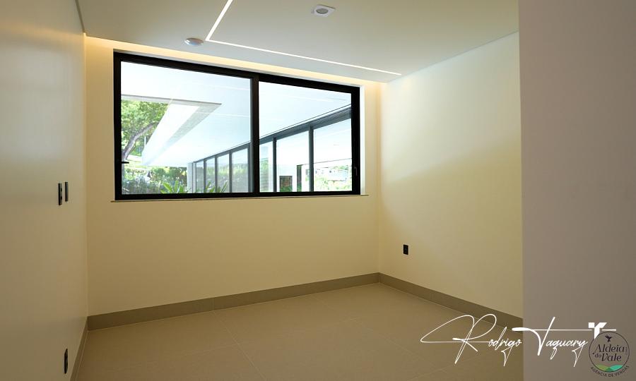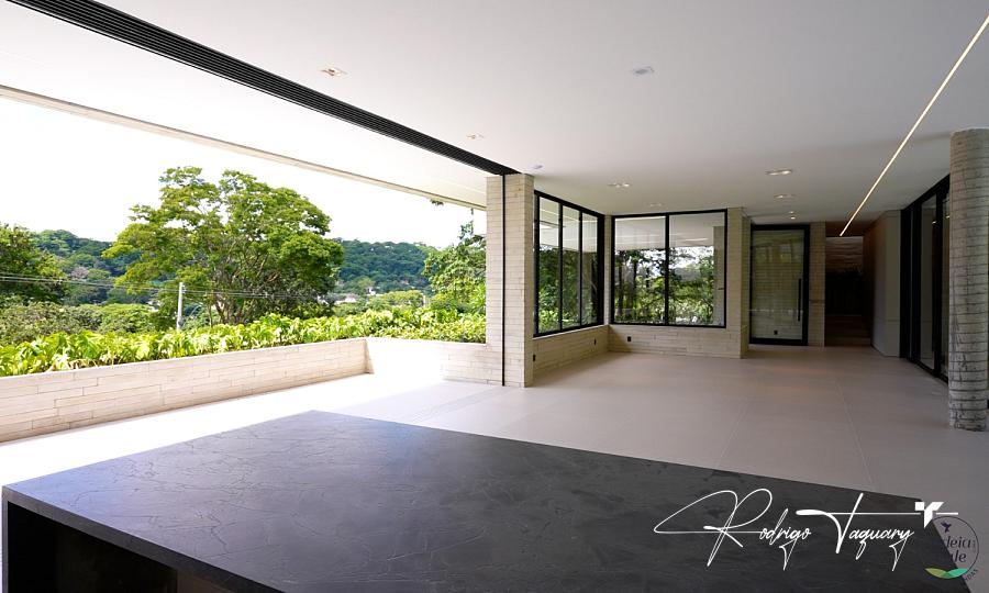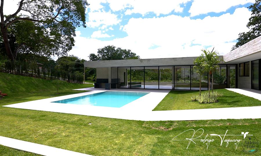 Residência exclusiva no Aldeia do Vale, com 568,03 m² de área construída em lote de 2.074,80 m². Projeto autoral de Peter Bal, que une design contemporâneo, integração total e contato permanente com a natureza. Living imponente com porta de correr motorizada de 17 m, painéis retráteis, claraboias ventiladas e paredes em ripado de concreto aparente.