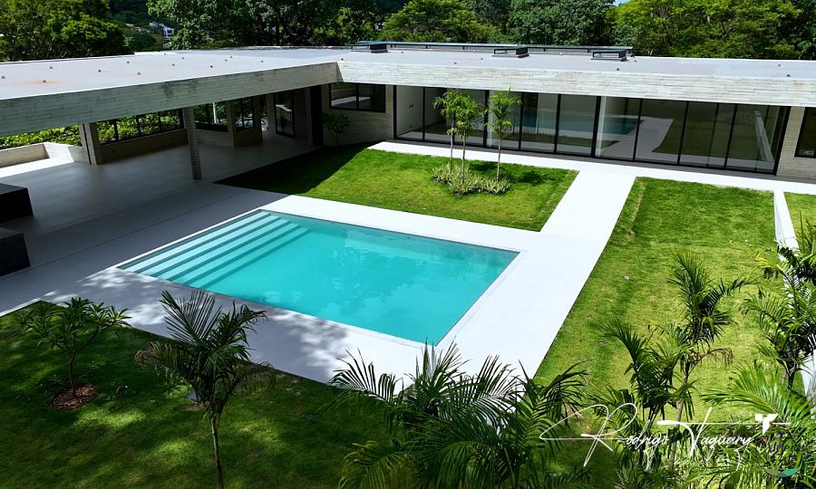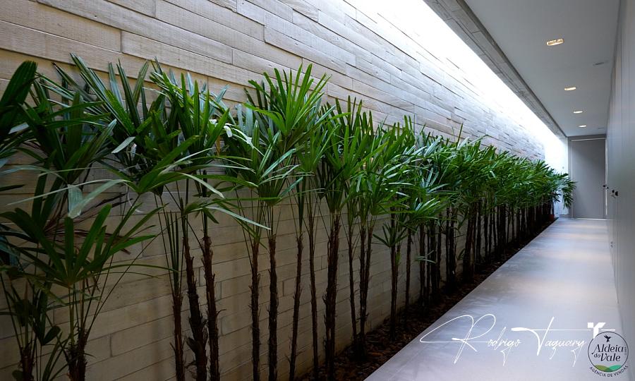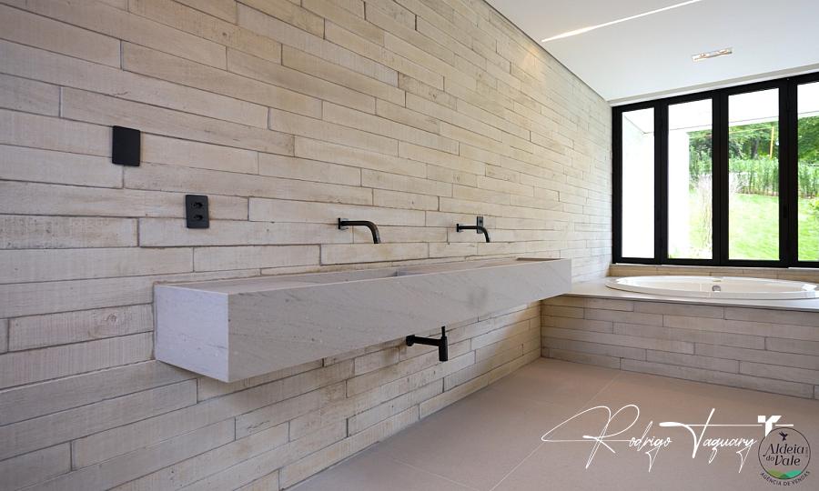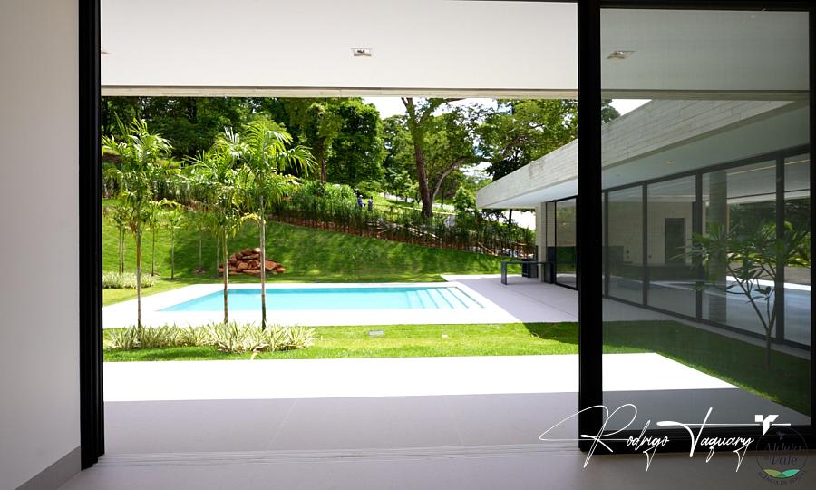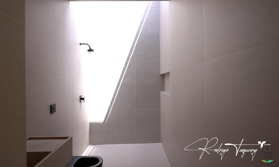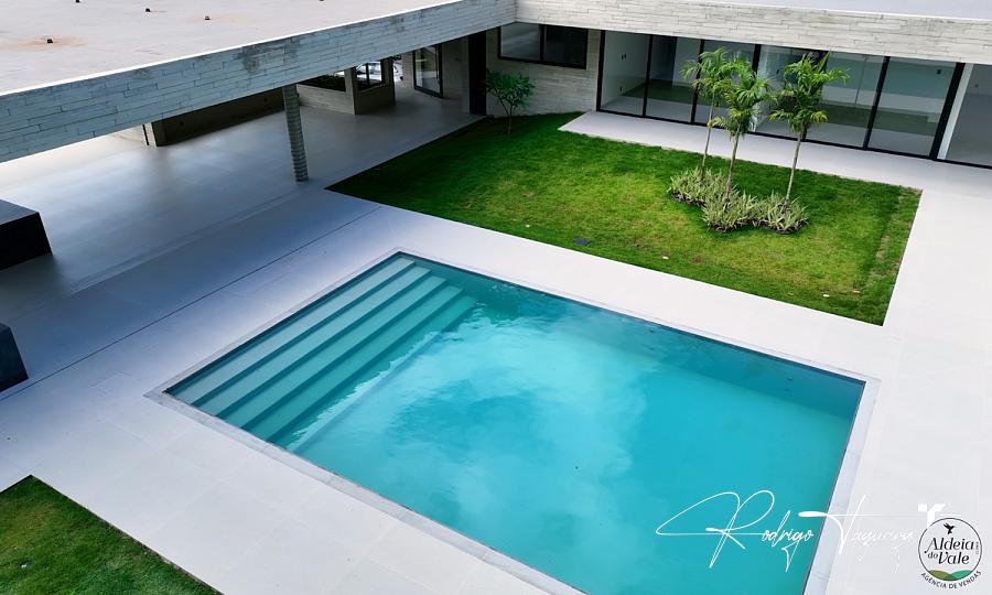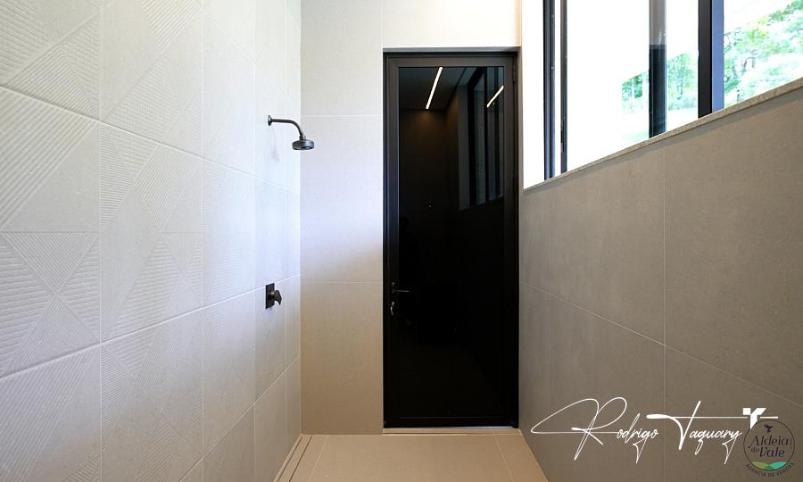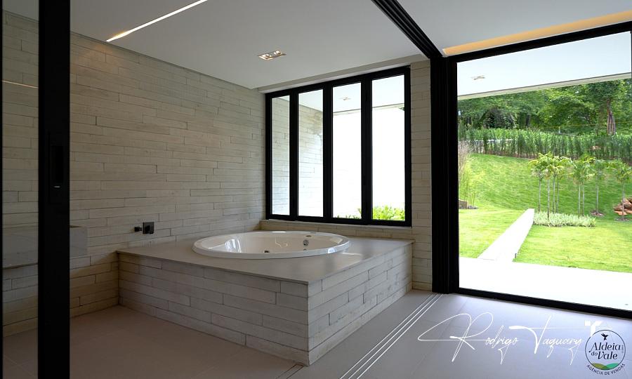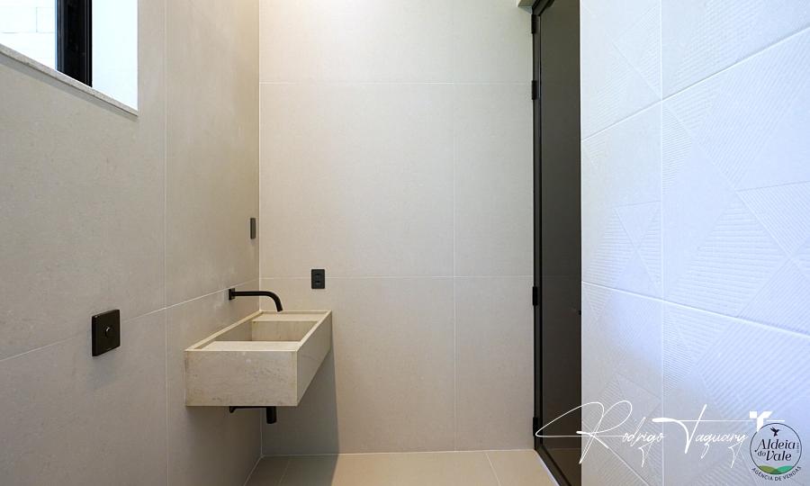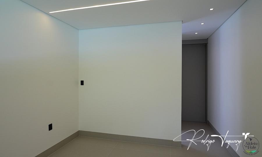Residência exclusiva no Aldeia do Vale, com 568,03 m² de área construída em lote de 2.074,80 m². Projeto autoral de Peter Bal, que une design contemporâneo, integração total e contato permanente com a natureza. Living imponente com porta de correr motorizada de 17 m, painéis retráteis, claraboias ventiladas e paredes em ripado de concreto aparente.