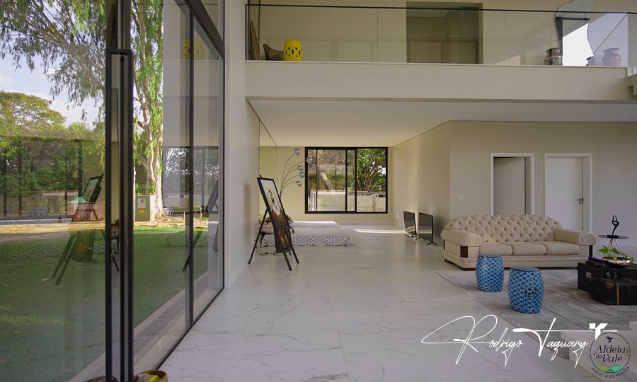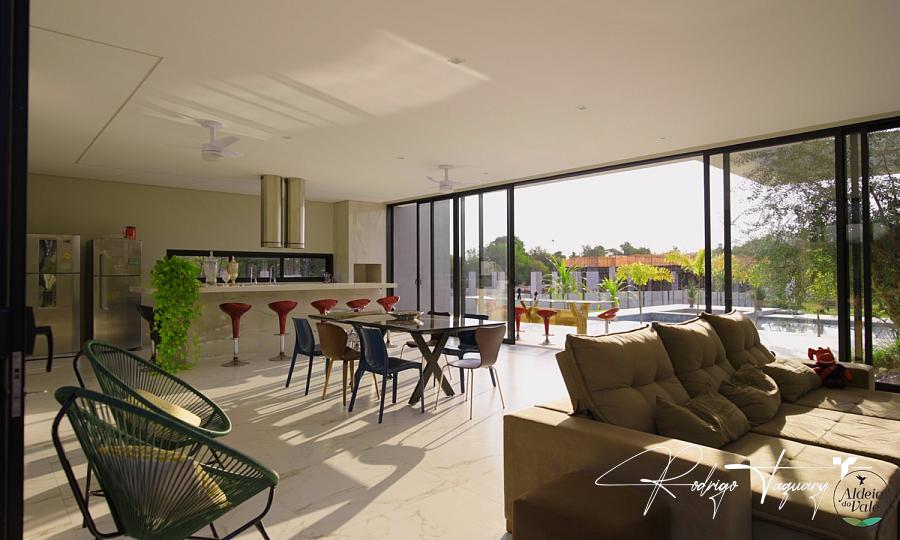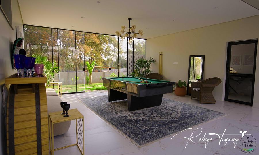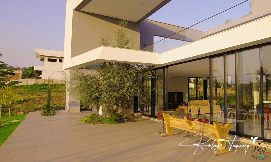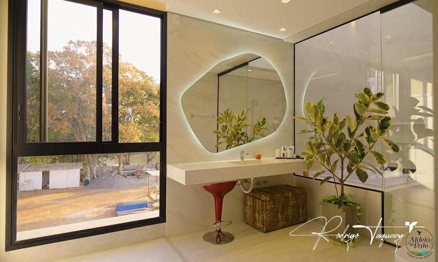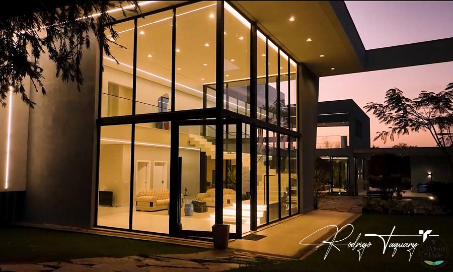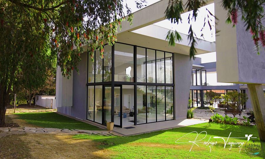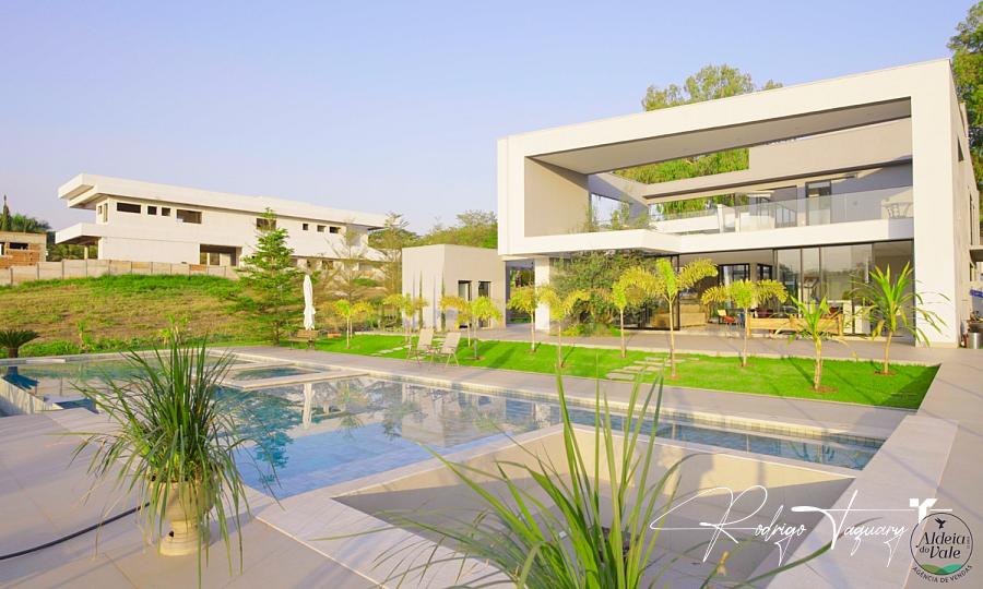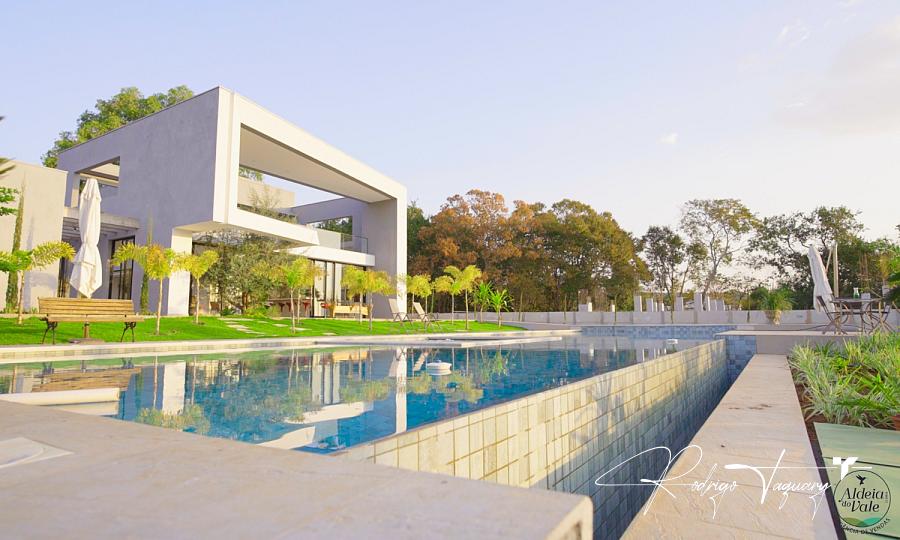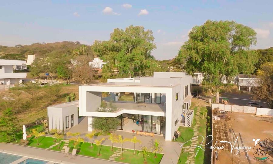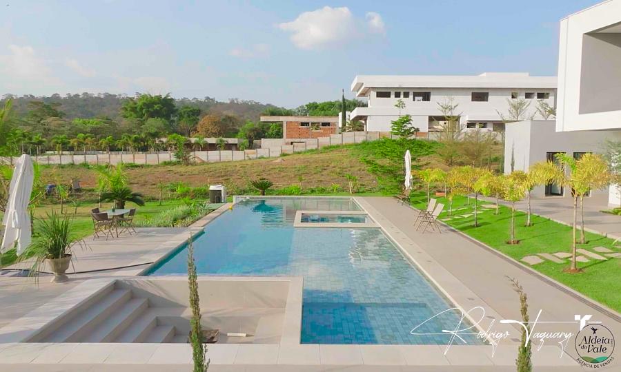 Sobrado exclusivo no Aldeia do Vale, com fundo de lago e projeto assinado pela LF Arquitetura, que valoriza integração e contato com a natureza. No térreo, sala de estar, home TV, lavabo, 1 suíte, espaço de jogos e praça interna com paisagismo. Cozinha e área gourmet com churrasqueira, varanda ampla e integração à piscina aquecida com raia, prainha, hidromassagem, fireplace, deck e pomar à beira do lago.