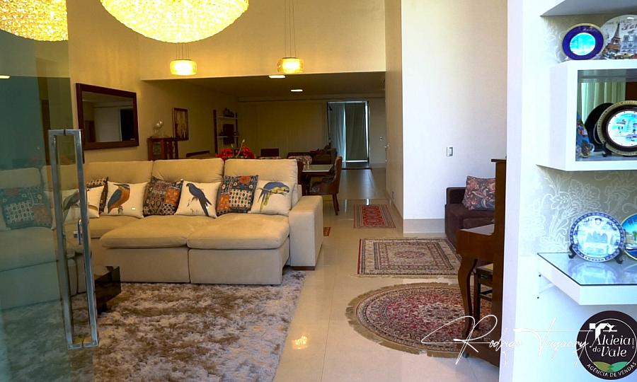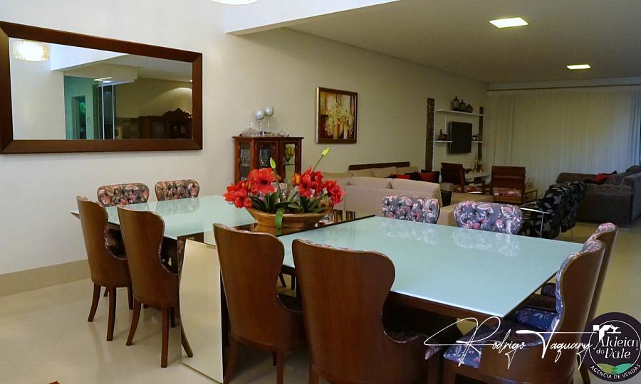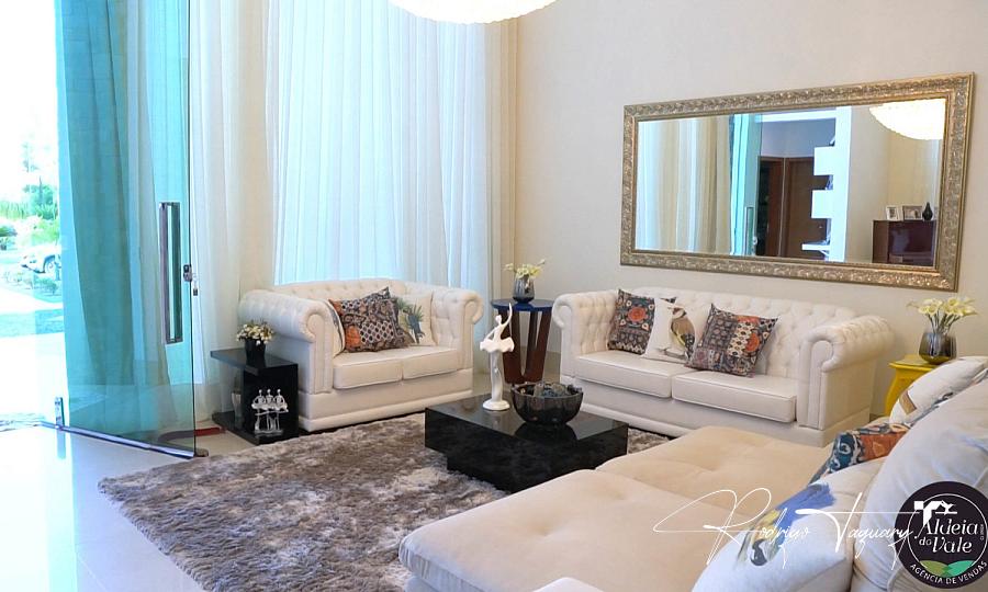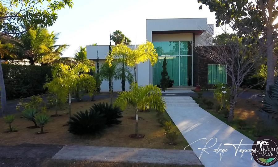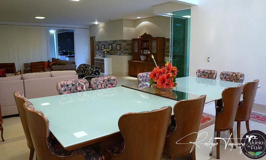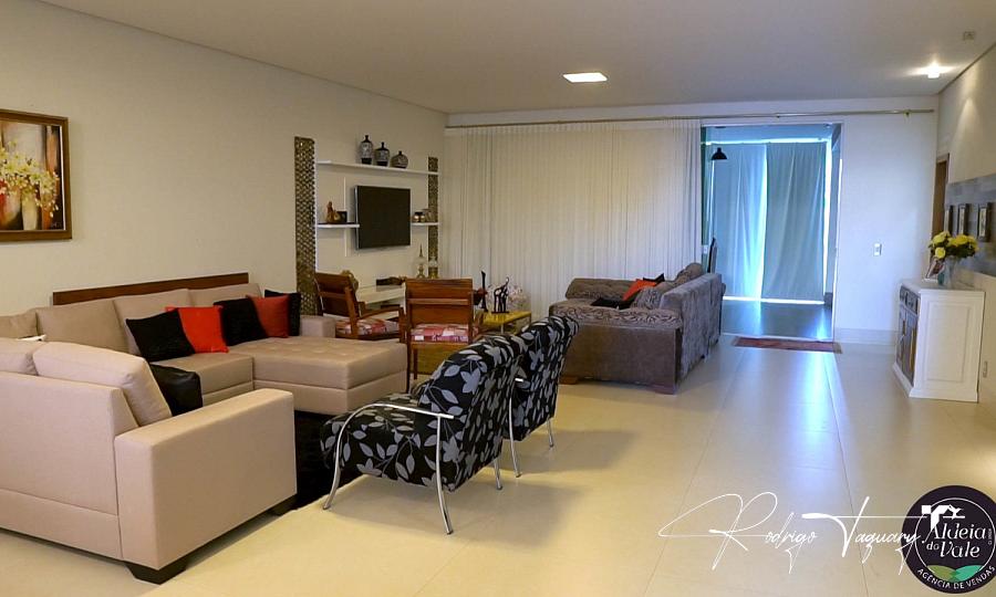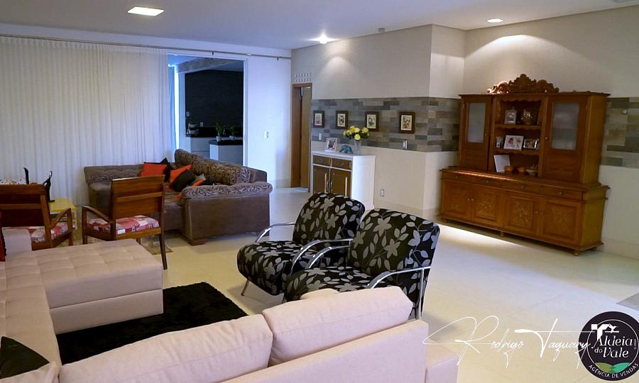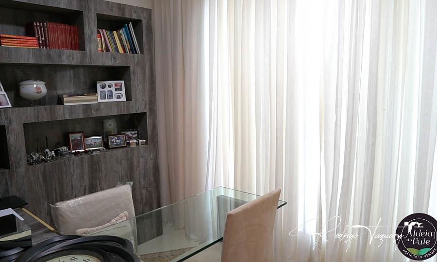 Casa térrea elevada no Aldeia do Vale, com vista definitiva para o fundo do vale e projeto que valoriza integração, conforto e privacidade. São 4 suítes plenas com armários, incluindo a máster com closet e hidromassagem. Sala com pé-direito elevado e dois ambientes integrados à varanda, escritório privativo, lavabo, cozinha funcional e área de serviço independente. Piso em porcelanato Porto Ferreira 90x90 cm.