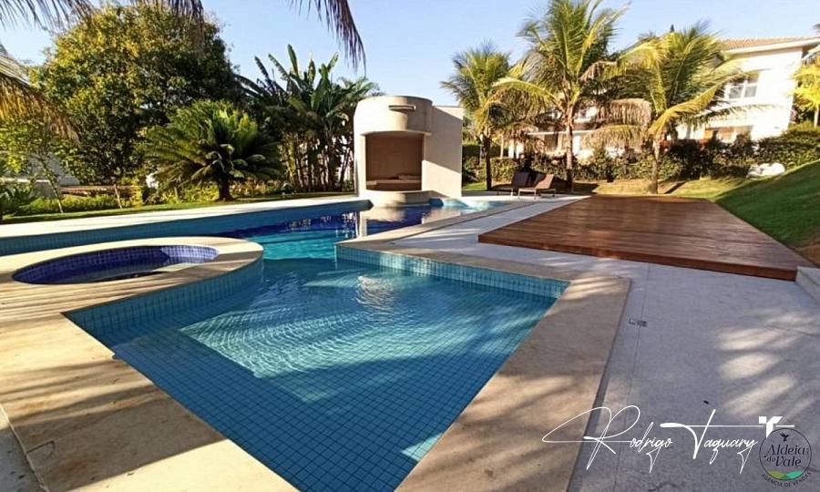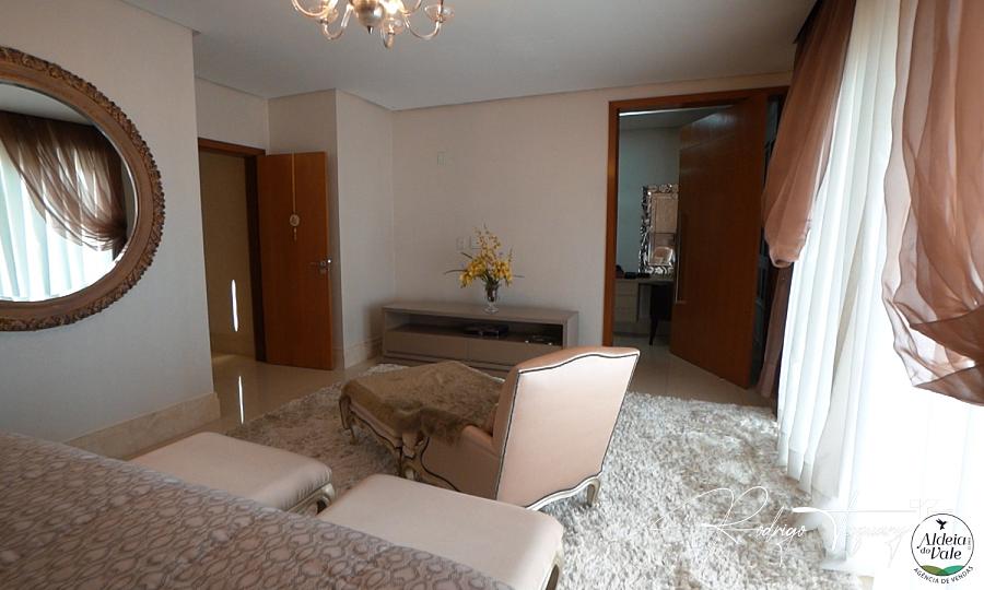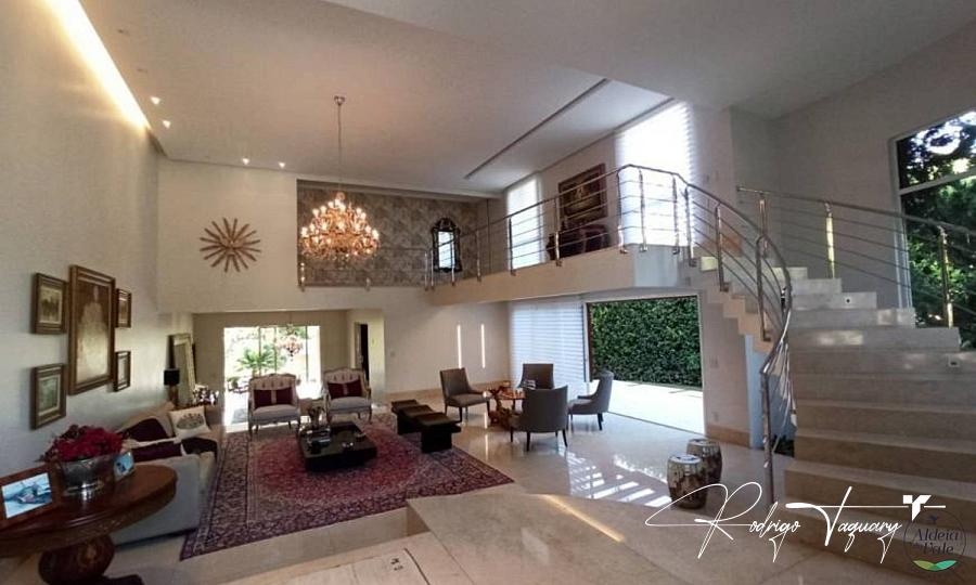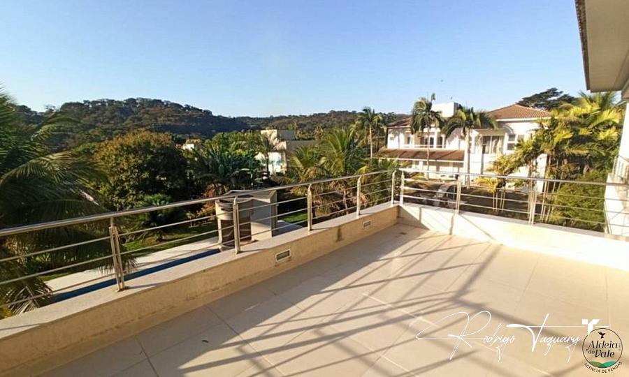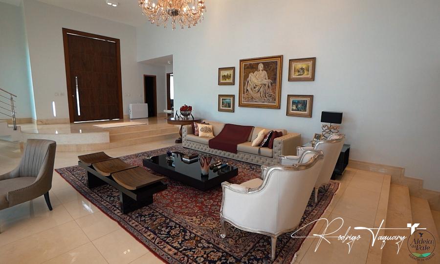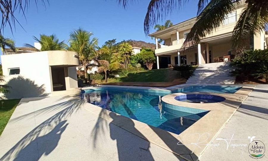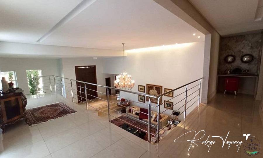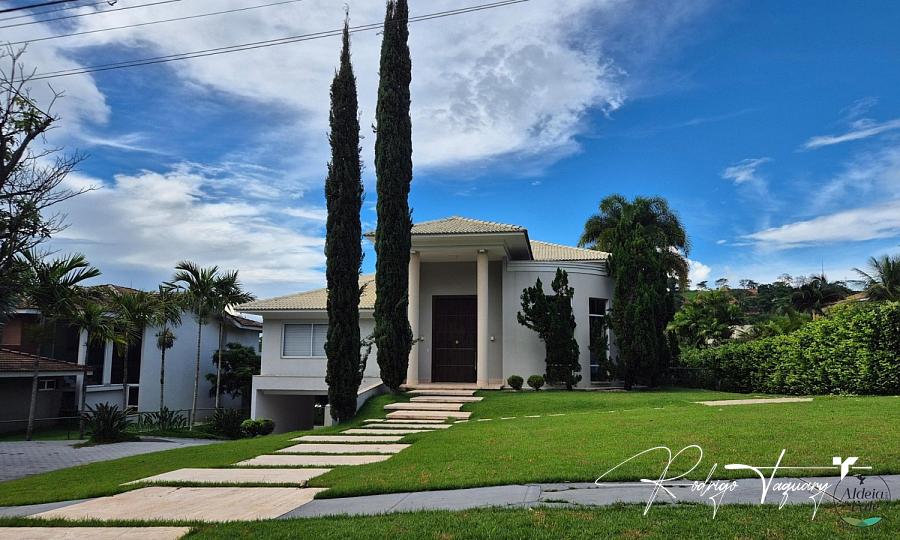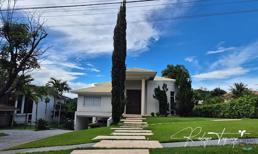 Sobrado imponente no Aldeia do Vale, com arquitetura neoclássica e ambientes sofisticados. Conta com ampla sala com pé-direito elevado, escritório, home cinema e cozinha com armários. No piso superior, 4 suítes, incluindo a máster com jacuzzi e closet.