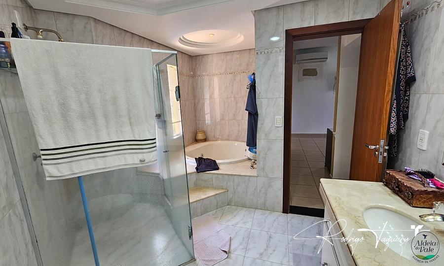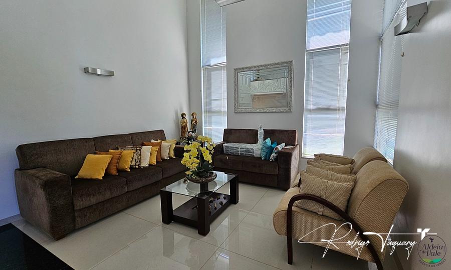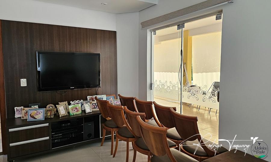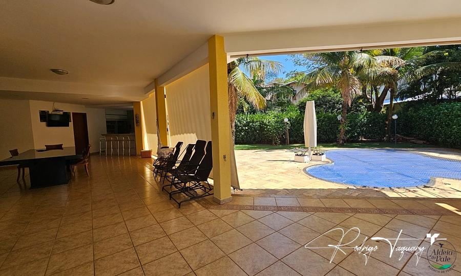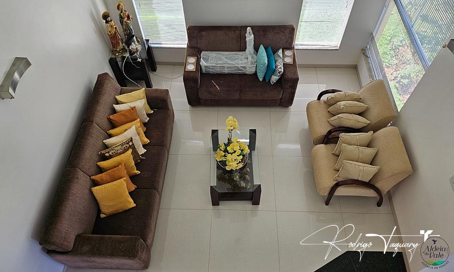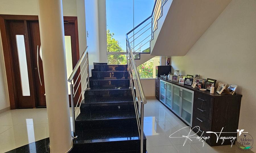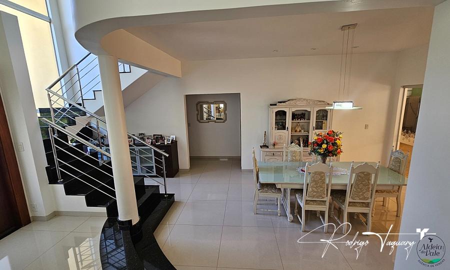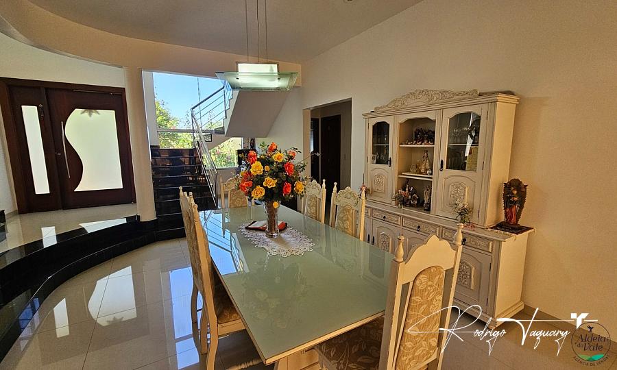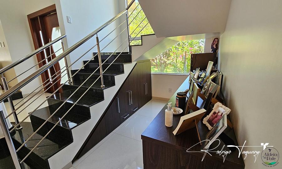 Sobrado amplo no Aldeia do Vale, com quintal encantador, integração dos ambientes e projeto versátil. São 4 suítes no piso superior, incluindo máster com closet e sacada, além de sala íntima. No térreo, 1 quarto reversível com banheiro social, hall de entrada, salas de visitas, jantar e TV, cozinha espaçosa, área de passar, despensa, lavanderia e DCE completa.