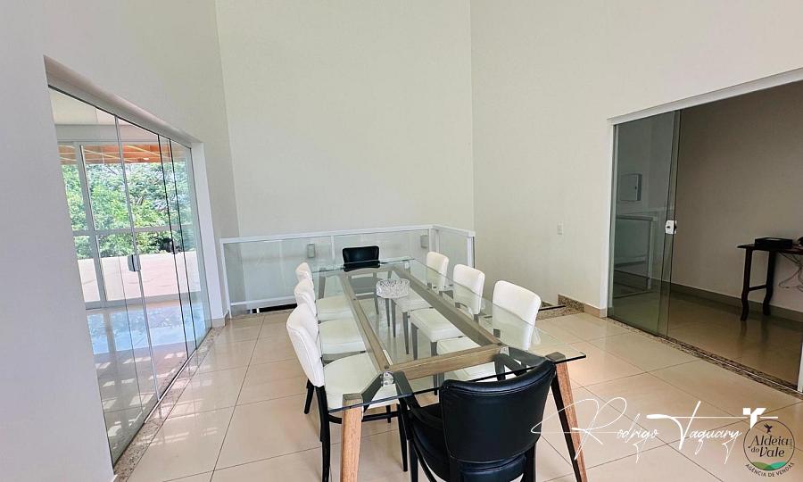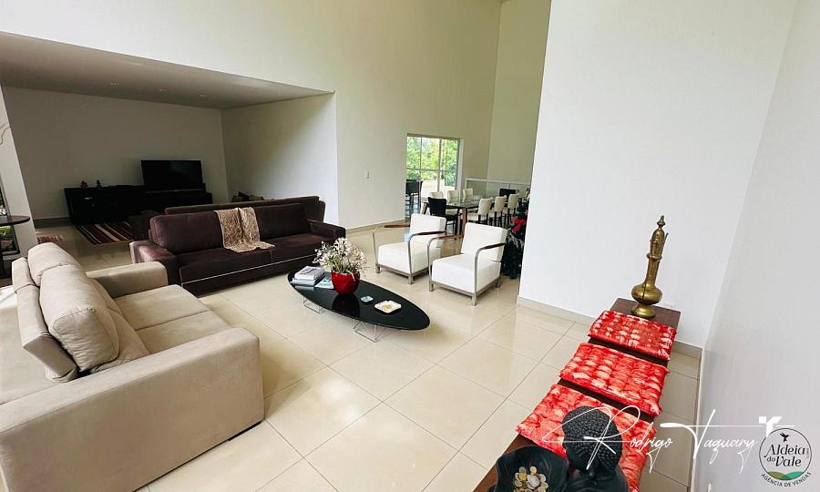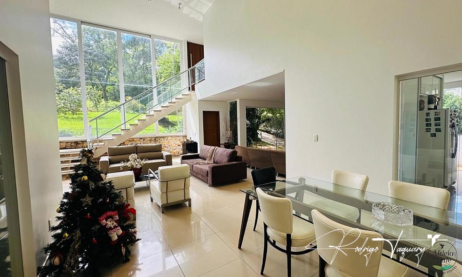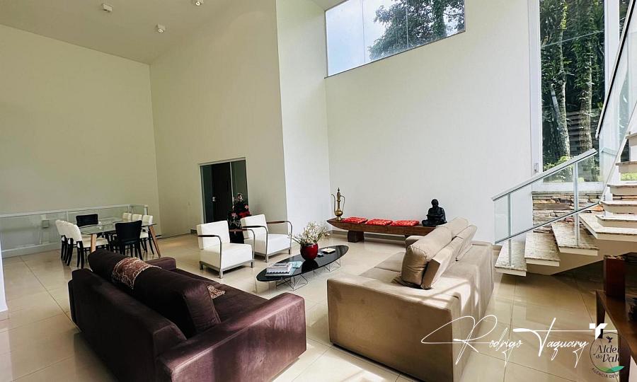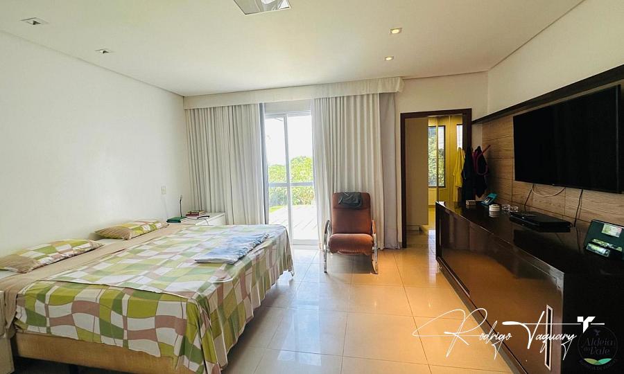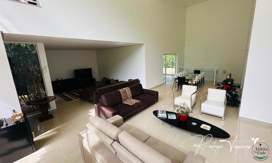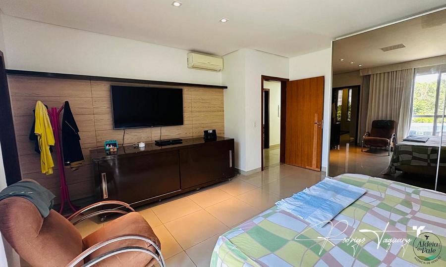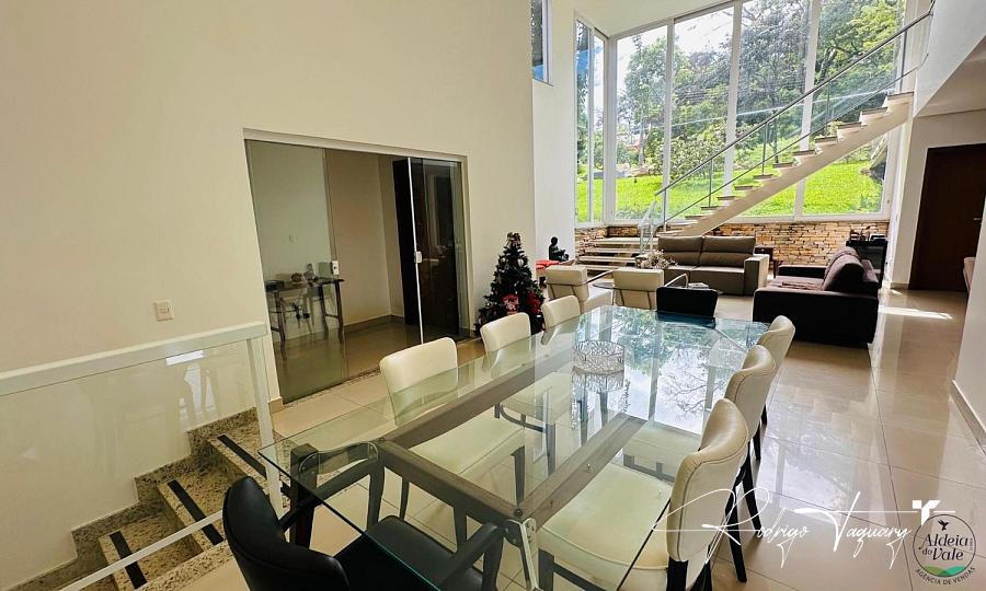 Sobrado exclusivo no Aldeia do Vale, com vista definitiva para o lago e a mata. Projeto funcional com ambientes integrados: salas de estar, jantar e TV, cozinha com varanda e lavabo. No piso superior, 4 suítes, incluindo a máster com closet, hidromassagem e varanda privativa. Garagem coberta para 2 veículos.