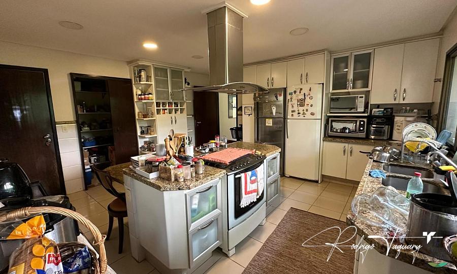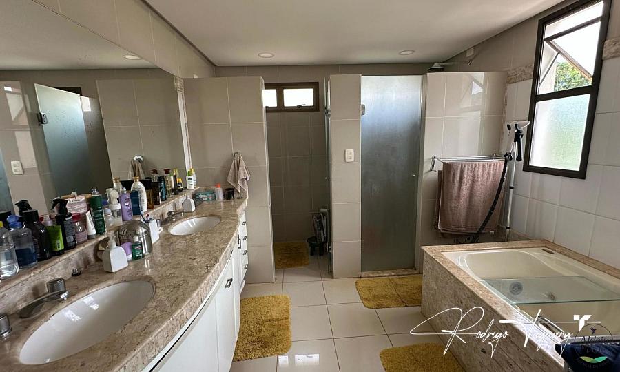 O sobrado oferece 5 suítes, sendo duas no térreo e duas no pavimento superior, além de uma suíte máster com hidromassagem, closet e frigobar. A casa conta ainda com sótão preparado para receber uma 6ª suíte. A área social é composta por sala integrada de estar, jantar e TV, cozinha equipada, despensa, roupeiro e ambientes funcionais com excelente iluminação natural.