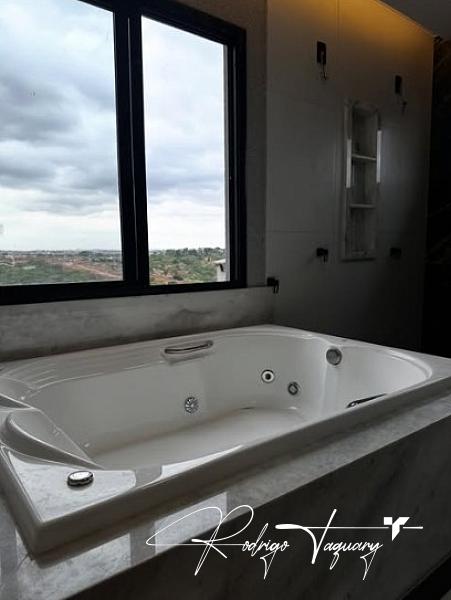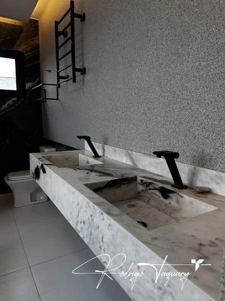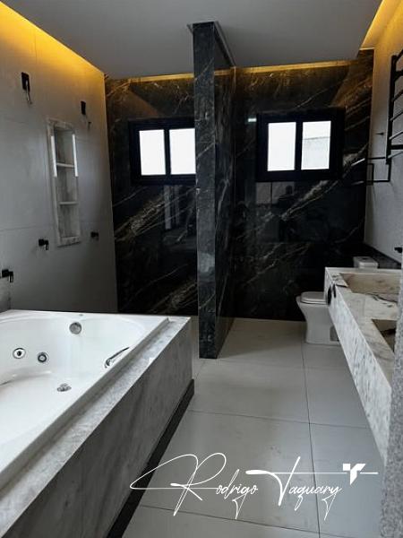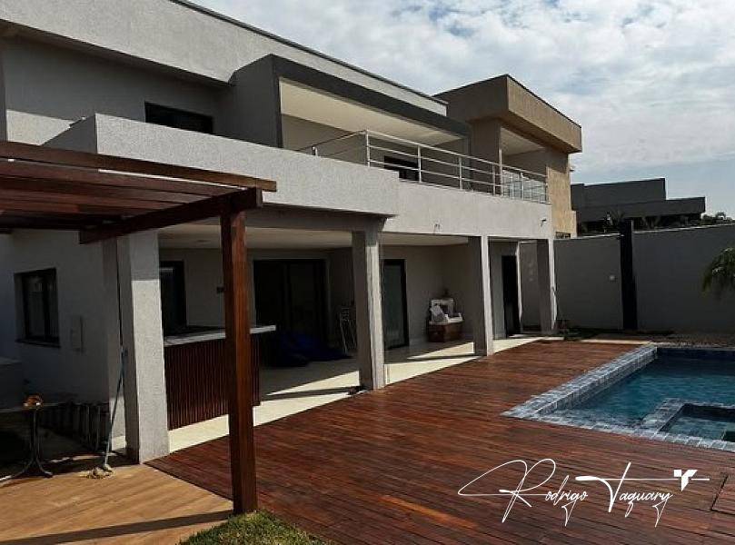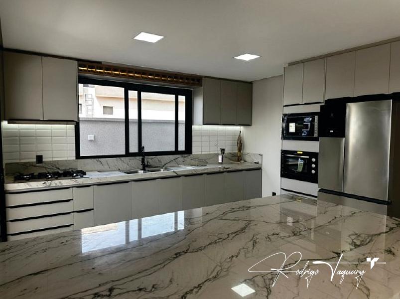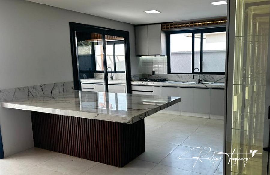 4 suítes (2 no térreo e 2 máster no pavimento superior, com varandas e hidromassagem dupla), sala de TV com pé-direito duplo, cozinha e área gourmet integradas, armários planejados e eletros Fit Line. Garagem para até 6 carros.