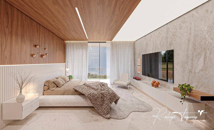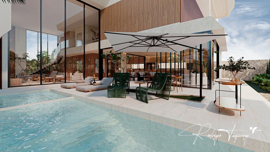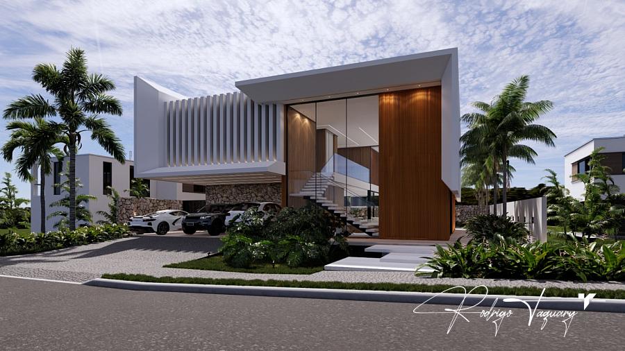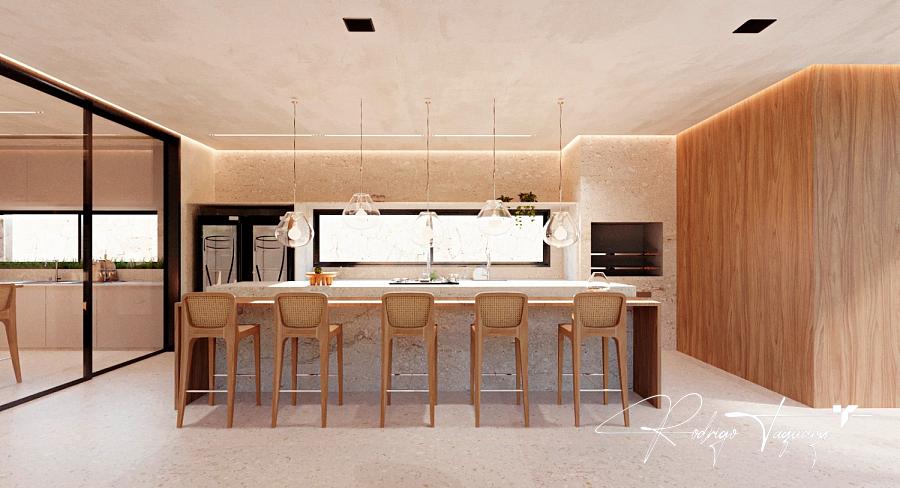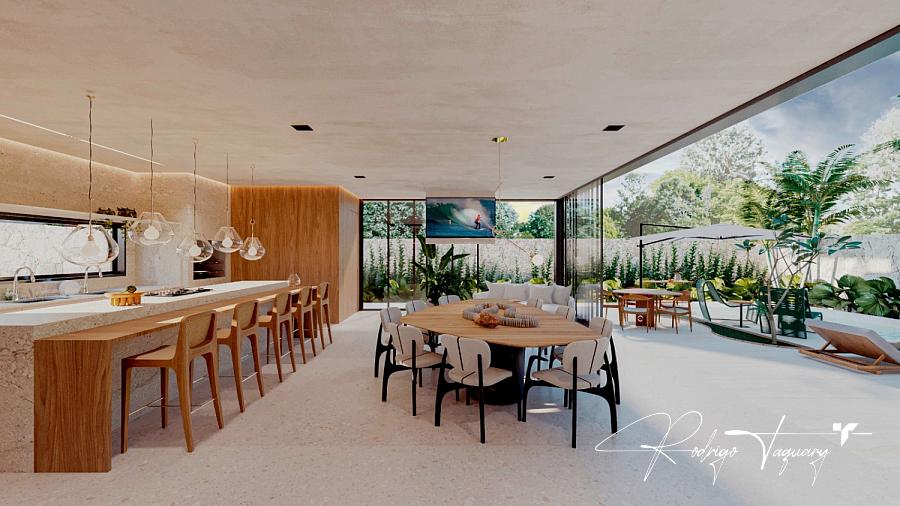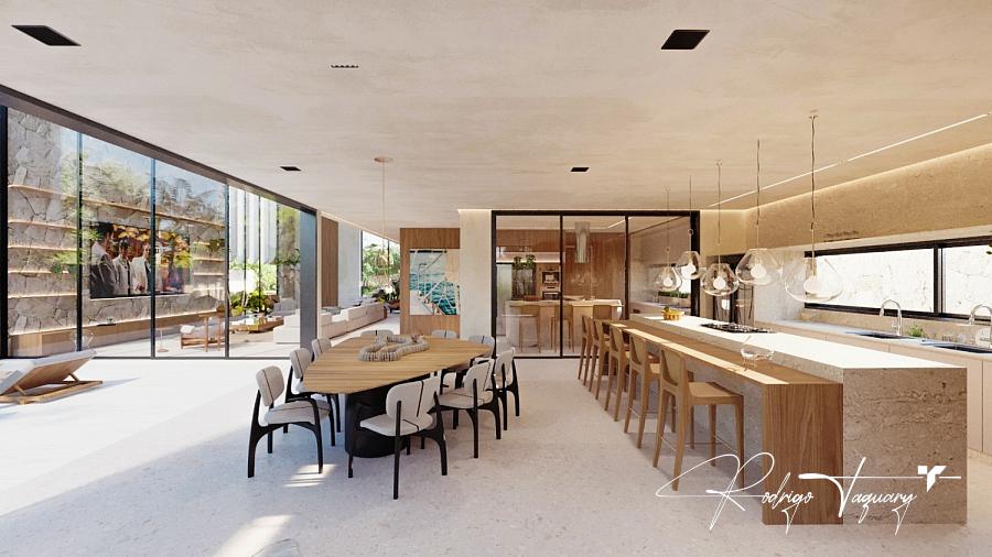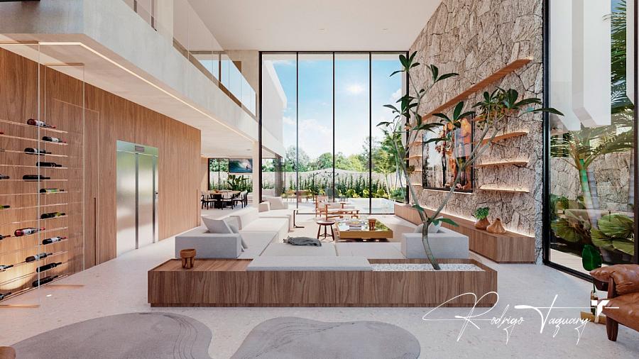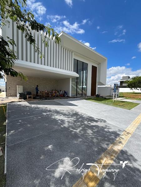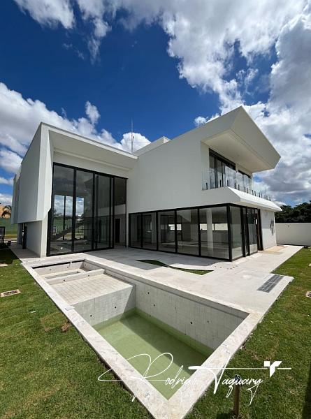 Residência contemporânea, com 5 suítes plenas (sendo 1 no térreo), sala com pé-direito duplo, cozinha integrada e área de lazer completa com piscina e churrasqueira a carvão.